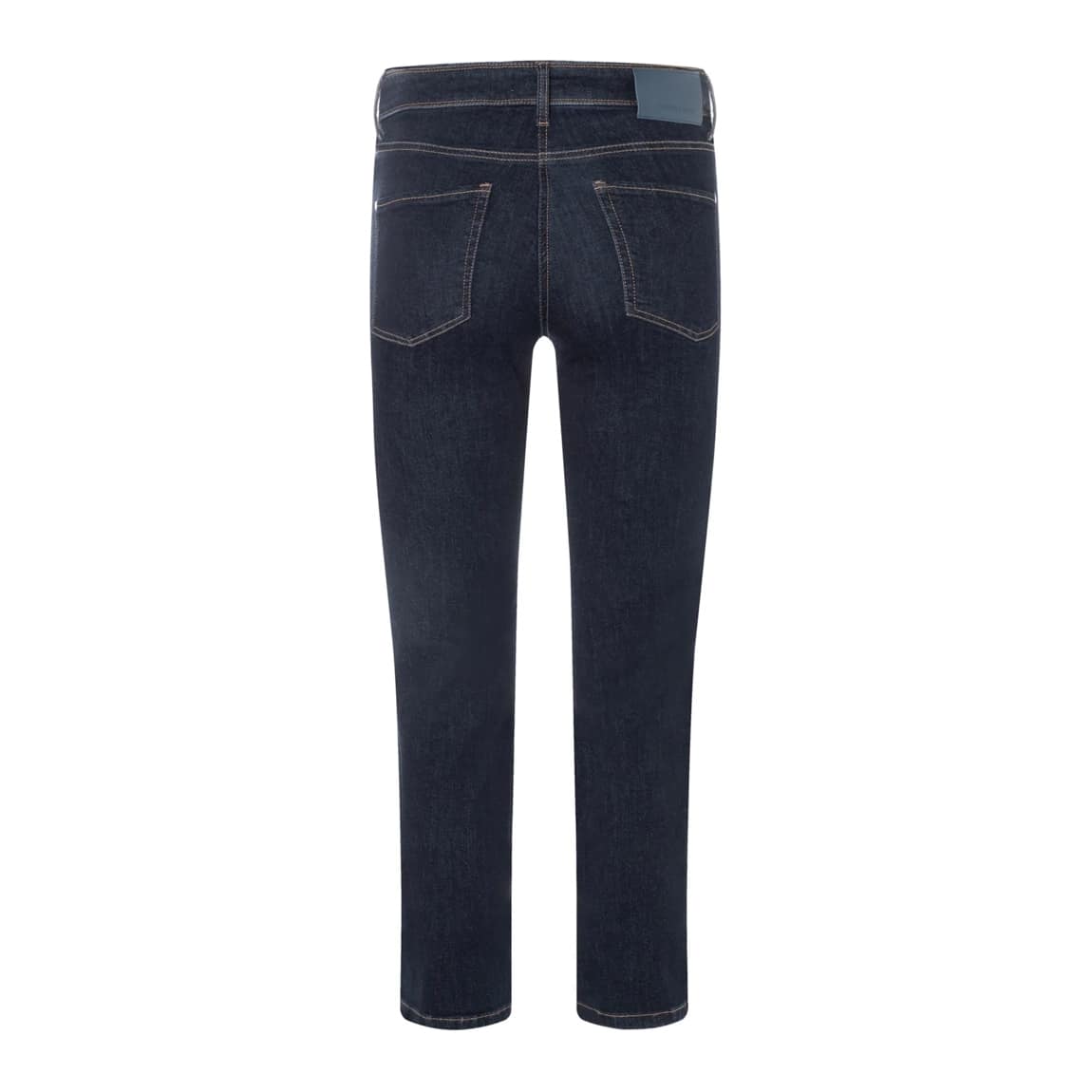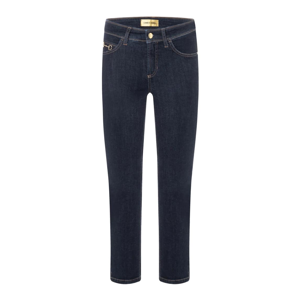 Donkerblauwe jeans van Cambio, model Piper Short in modern rinsed. Deze spijkerbroek is gemaakt van stretch denim en heeft een slim fit pasvorm met een normale taille. De jeans sluit met een knoop- en ritssluiting, heeft twee steekzakken en twee achterzakken.