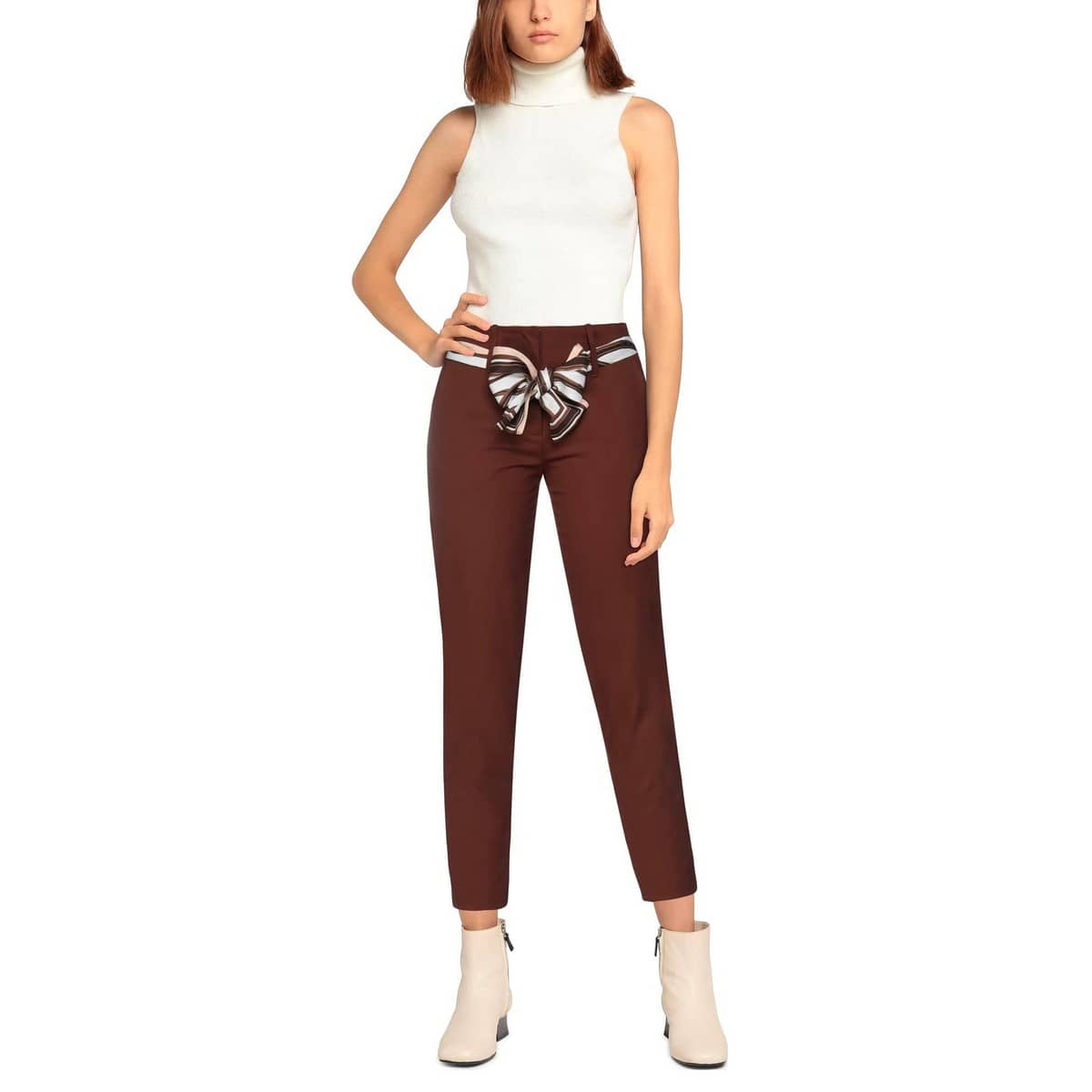 Bruine pantalon van Cambio, model Krystal. Deze slim fit broek is gemaakt van een effen bruine stof met een touch van rood en heeft een bijpassend sjaaltje. De pantalon heeft een 7/8 lengte, sluit met een haakje, knoop- en ritssluiting en heeft aan de voorzijde twee steekzakken en aan de achterzijde twee sier paspelzakken.