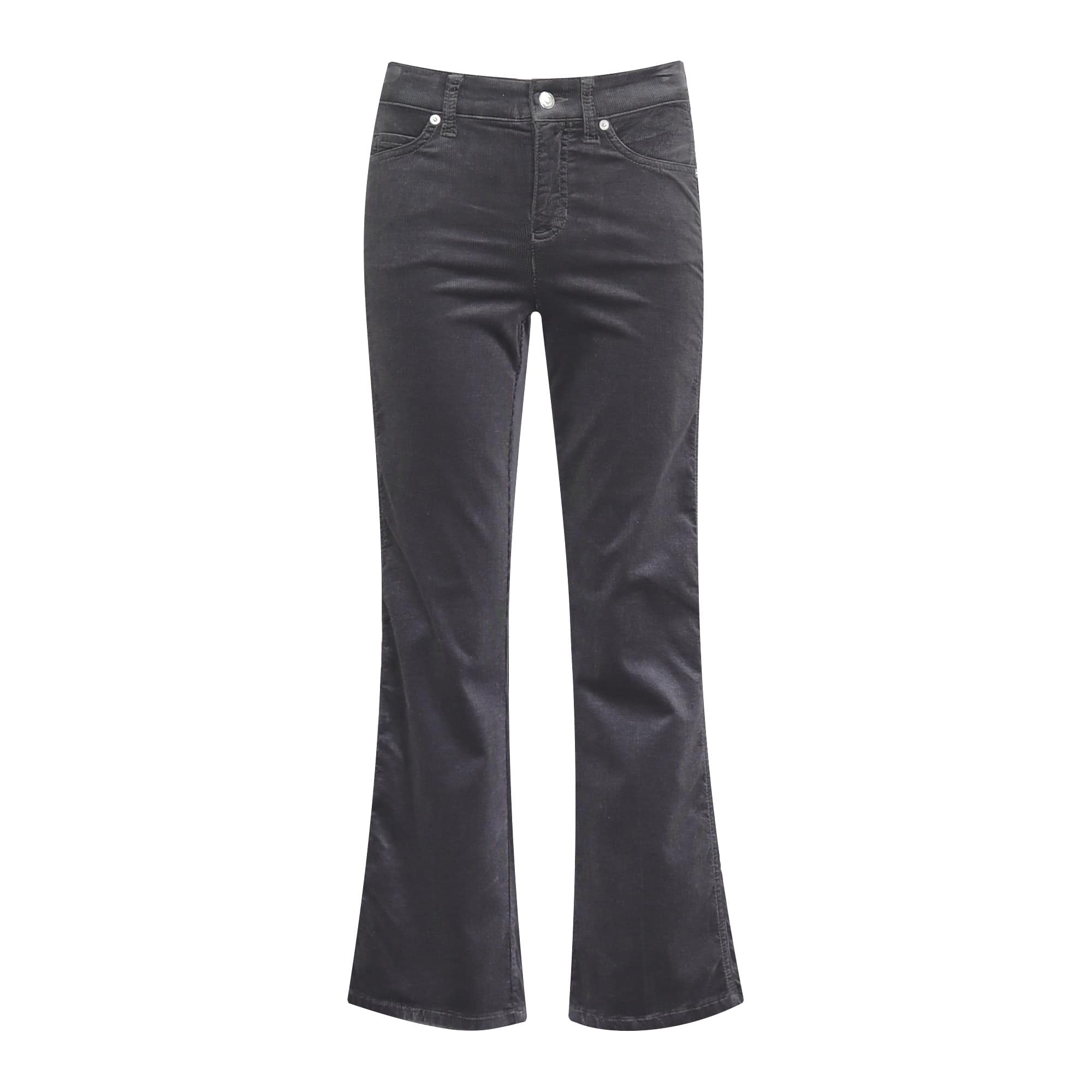 Corduroy pantalon van Cambio, model Francesca. Deze donkergrijze broek is gemaakt van een fijne ribfluwelen stretch stof en heeft rechte wijde broekspijpen die aan de onderzijde iets uitlopen. De broek sluit met een knoop- en ritssluiting, heeft twee steekzakken en twee achterzakken.