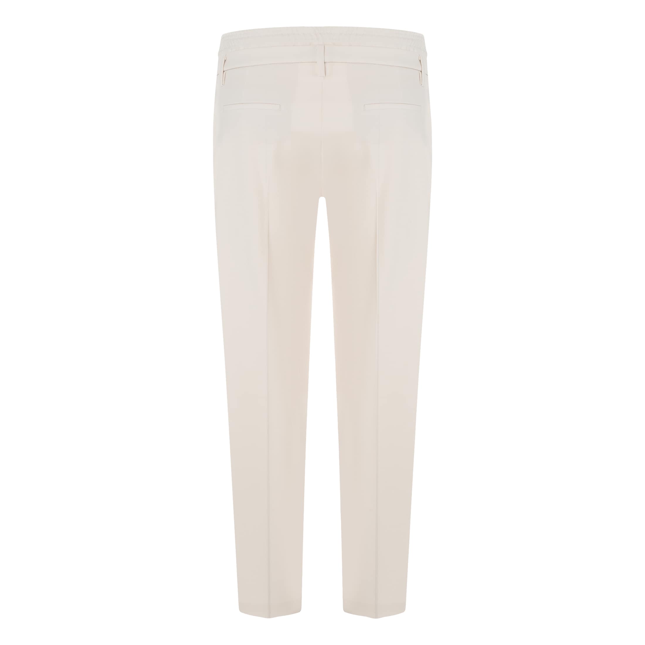 Ecru pantalon van Cambio, model Karen in pearl. Deze pantalon is gemaakt van een effen ecru stof en heeft toelopende broekspijpen. De broek sluit met haakjes, knoop- en ritssluiting, heeft twee steekzakken, dubbele taille met een trekkoord en twee sier paspelzakjes aan de achterzijde.