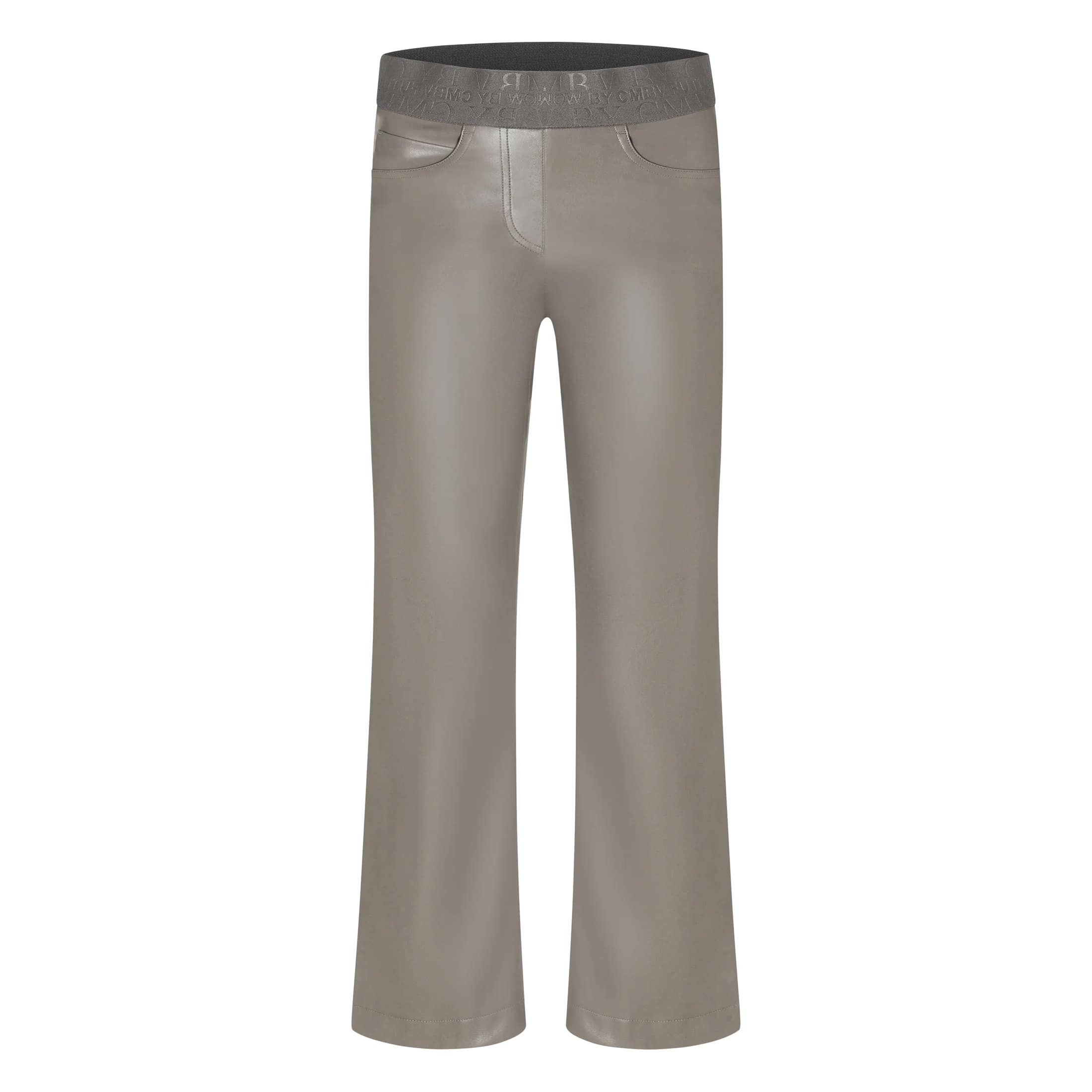 Grijs, groene pantalon van Cambio, model Felice in dusty olive. Deze broek is gemaakt van een leerlook stof en heeft een slim fit pasvorm met licht uitlopende broekspijpen. De pantalon heeft een elastische taille, twee steekzakken en twee achtrzakken.