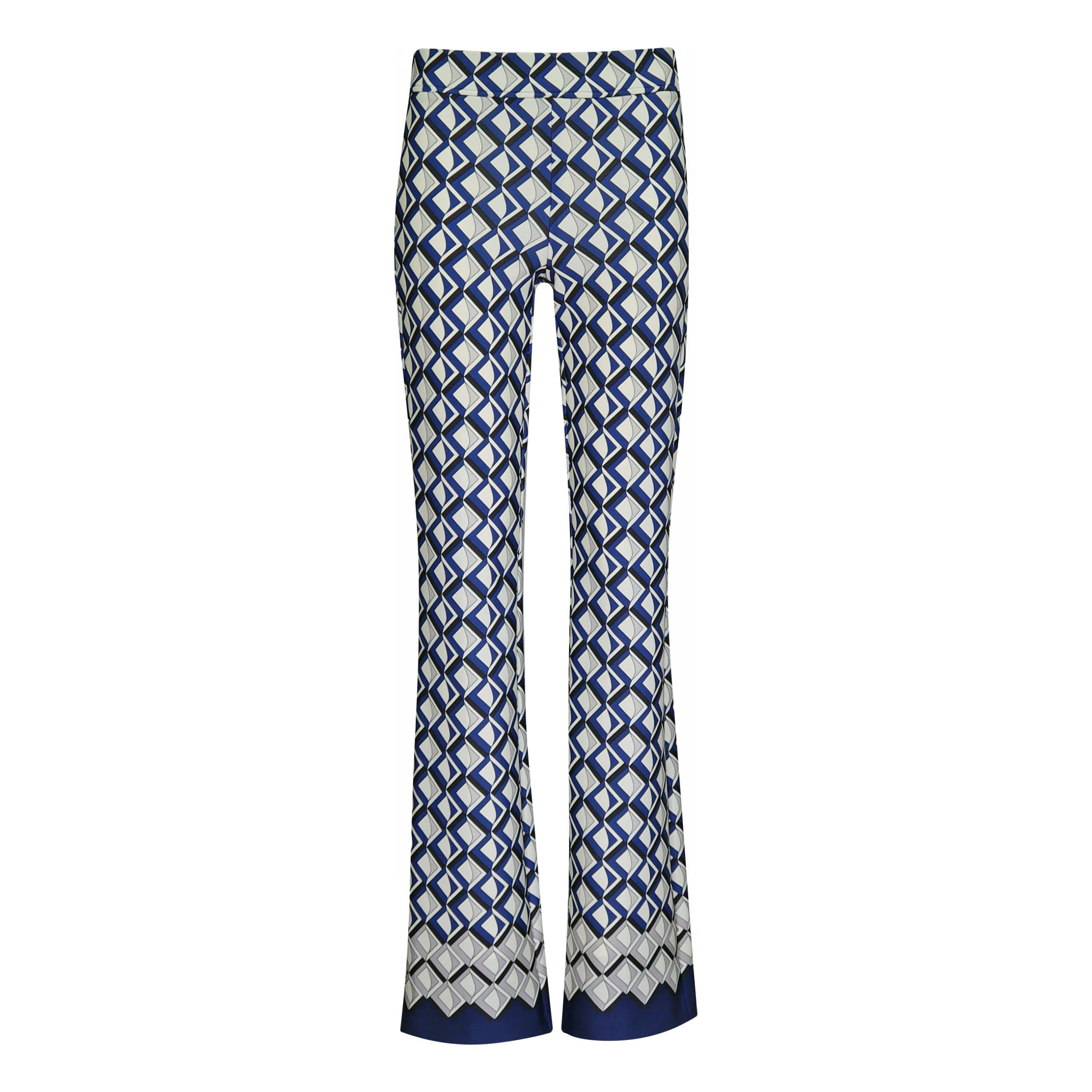 Flared pantalon van Cambio. Deze broek is gemaakt van een gladde stretch stof met een grafische print in blauw, grijs, zwart en creme. De pantalon heeft een hoge elastische taille, slim fit pasvorm en heeft licht uitlopend broekspijpen.