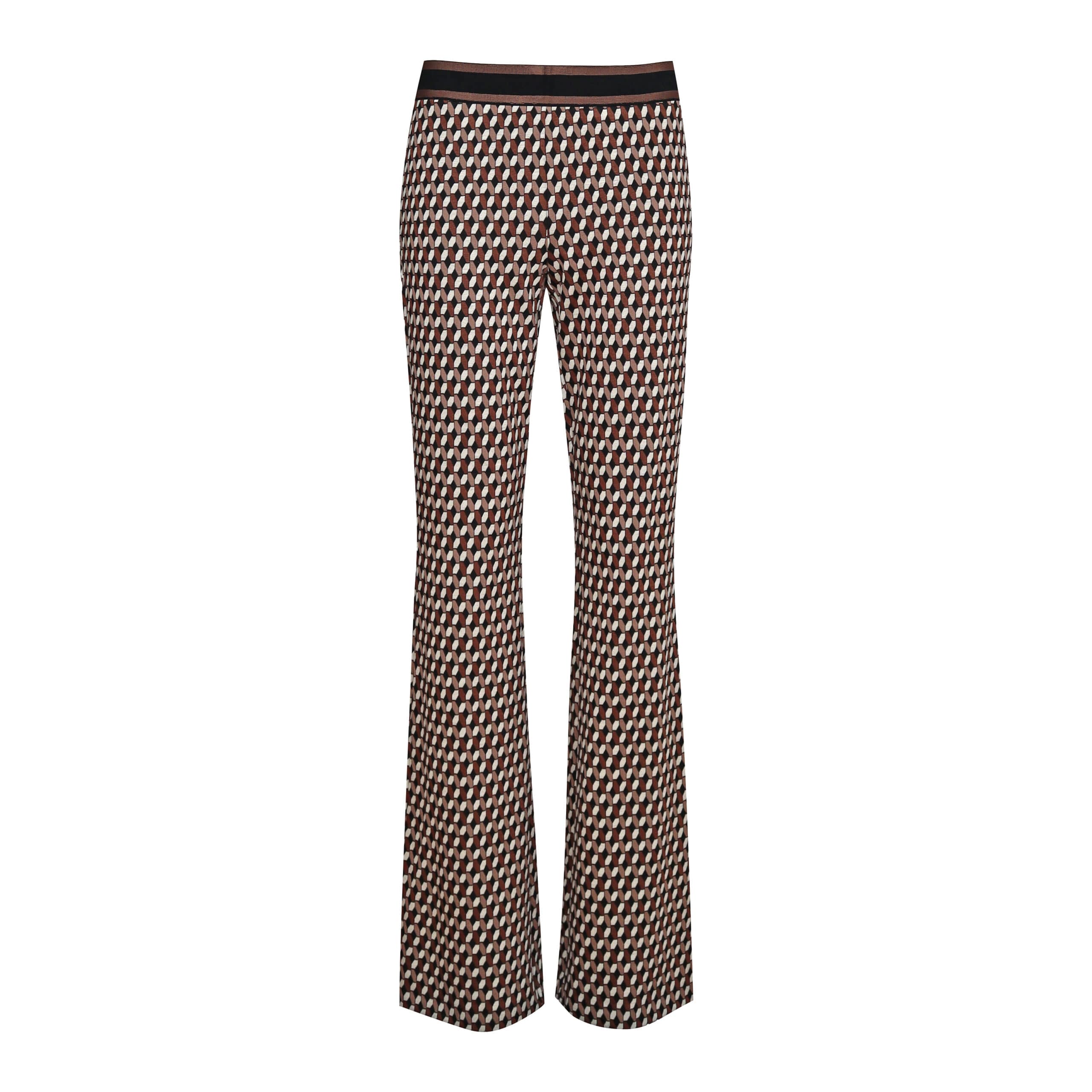 Flared pantalon van Cambio, model Flower. Deze broek is gemaakt van een  jersey stretch stof met een ecru, zwart, bruin geometrisch motief. De broek heeft een elastische tailleband en flared broekspijpen.