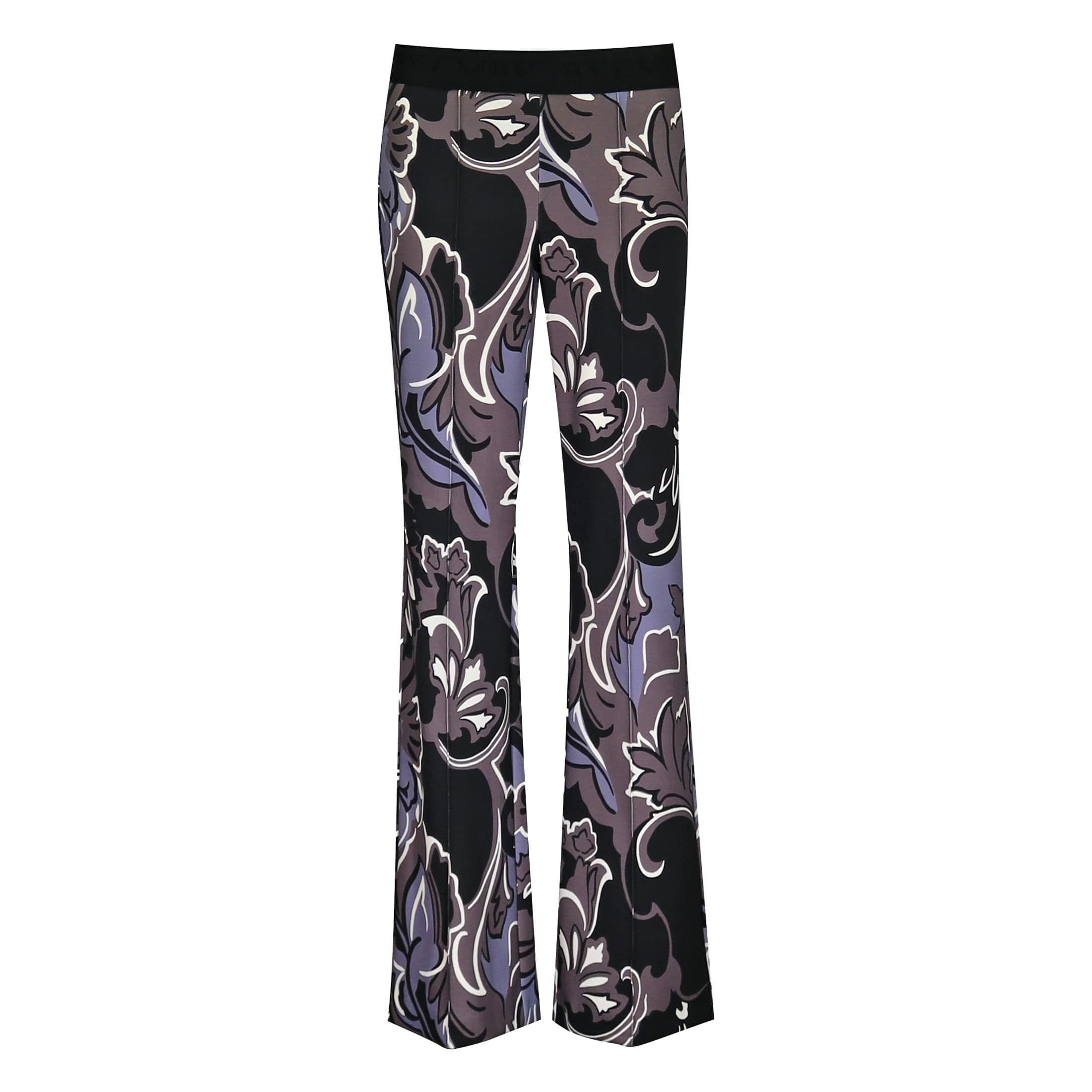 Flared pantalon van Cambio, model Flower. Deze broek is gemaakt van een gladde stretch stof met een zwart, wit, lila en grijs motief. De broek heeft een elastische tailleband, hoge taille en uitlopende broekspijpen.