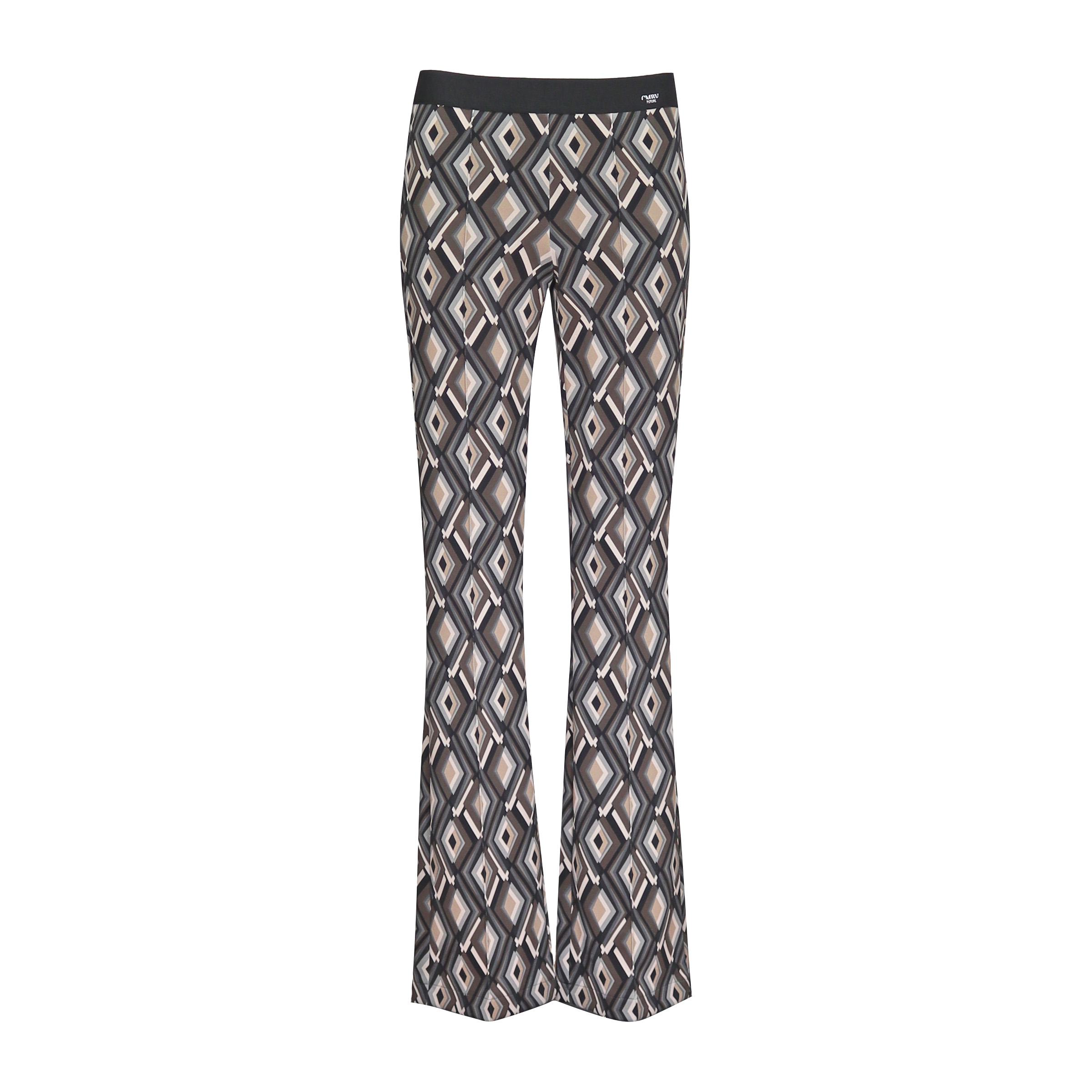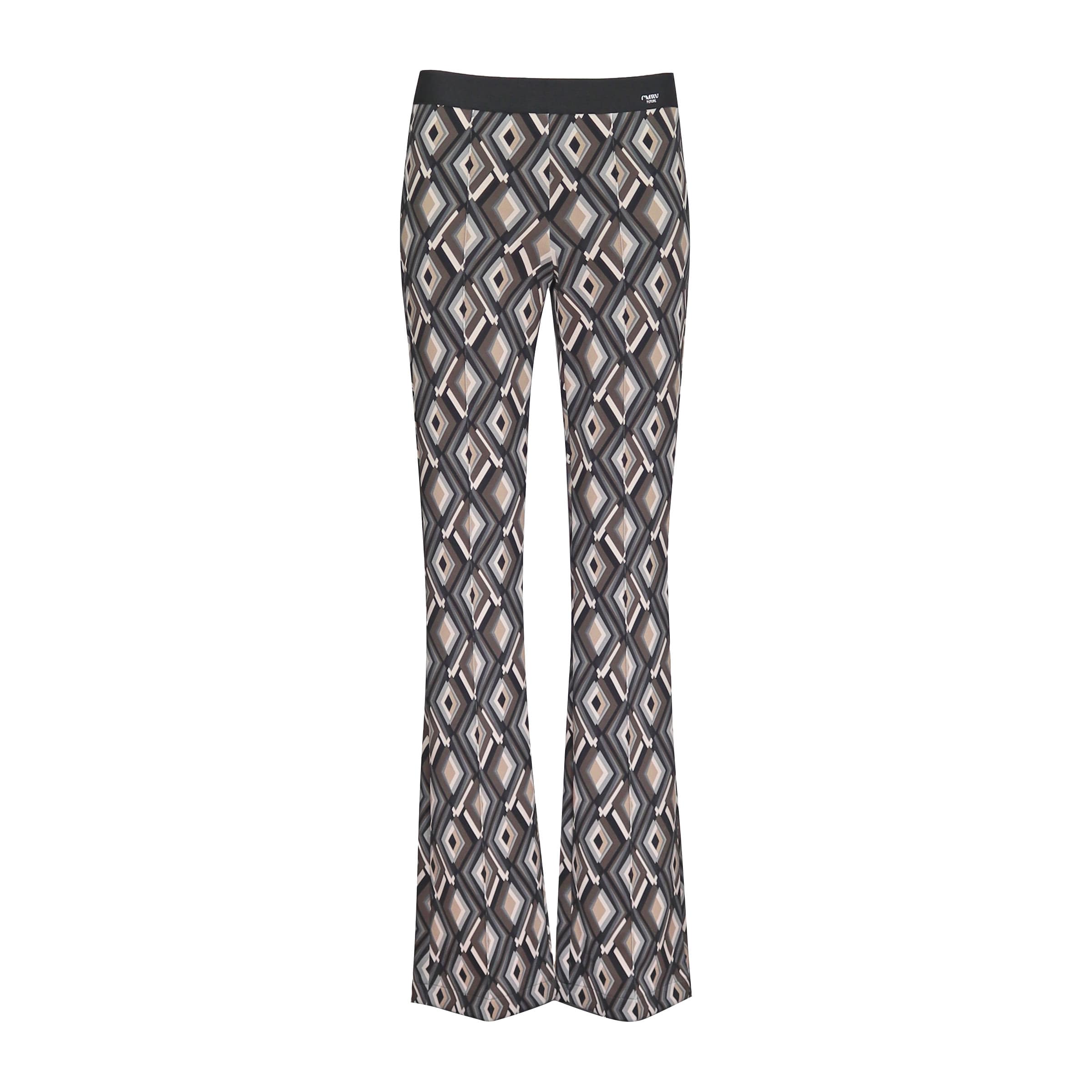 Flared pantalon van Cambio, model Flower. Deze broek is gemaakt van een gladde stretch stof met een zwart, grijs, bruin en wit geruit motief. De broek heeft een elastische tailleband, hoge taille en uitlopende broekspijpen.