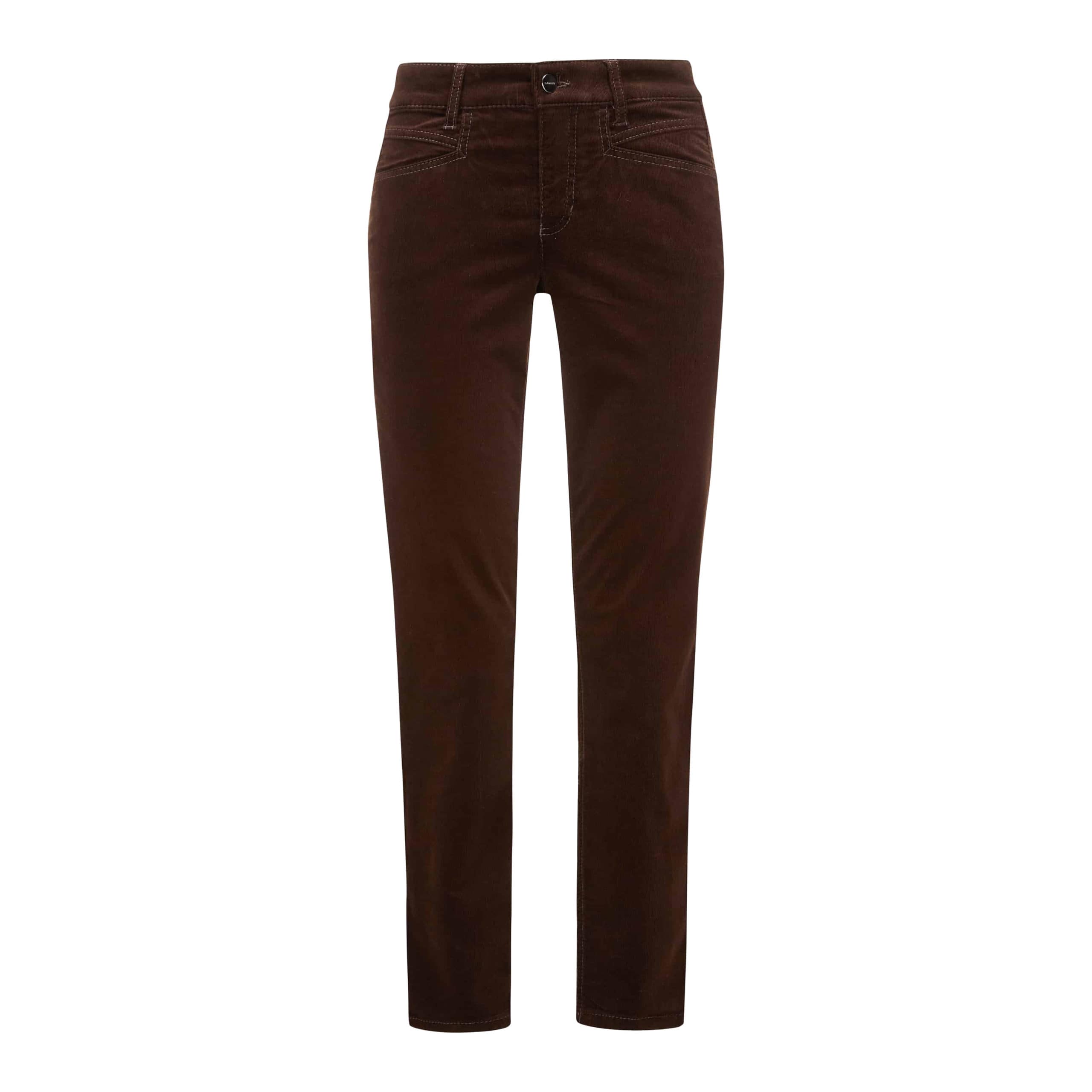 Corduroy broek van Cambio, model Pina Seam. Deze donkerbruine ribfluwelen broek heeft een rechte pasvorm met een medium taille. De broek sluit met een knoop- en ritssluiting, heeft twee steekzakken en twee achterzakken.