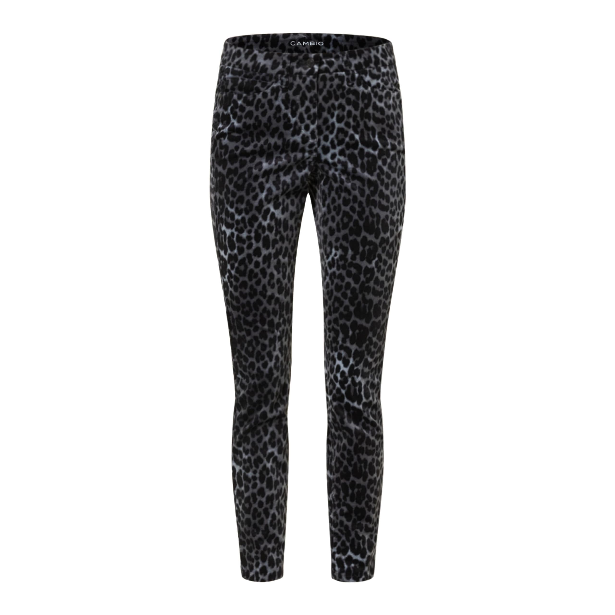 Slim fit pantalon van Cambio, model Ray 5-pocket. Deze broek is gemaakt van een fluwelen stretch stof met een grijs, zwarte luipaard print. De broek heeft toelopende broekspijpen, twee steekzakken, twee achterzakken en sluit met een knoop- en ritssluiting.