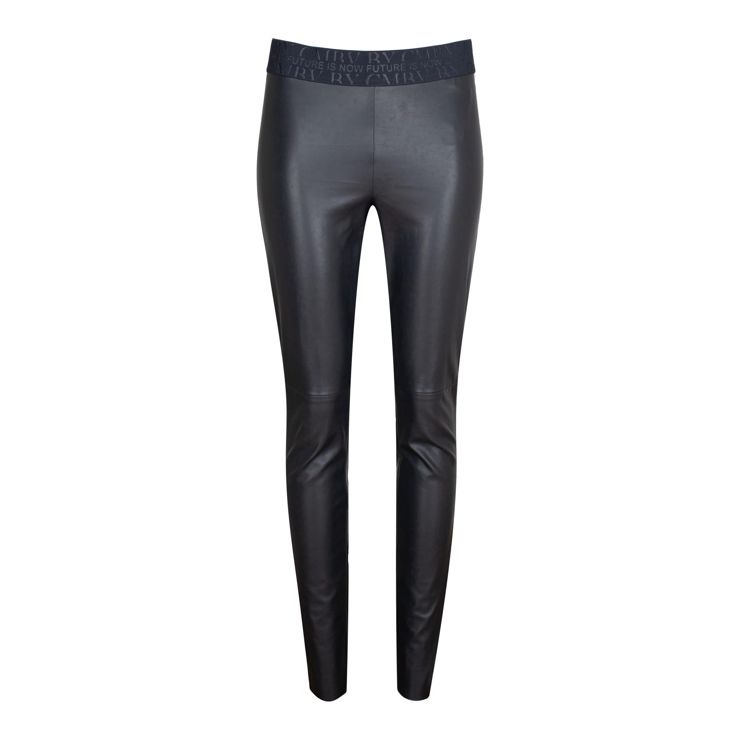 Skinny pantalon van Cambio, model Randa. De faux leather broek heeft een elastische tailleband en aansluitende pasvorm. De broek is gemaakt van een grijs bruine stretch stof.