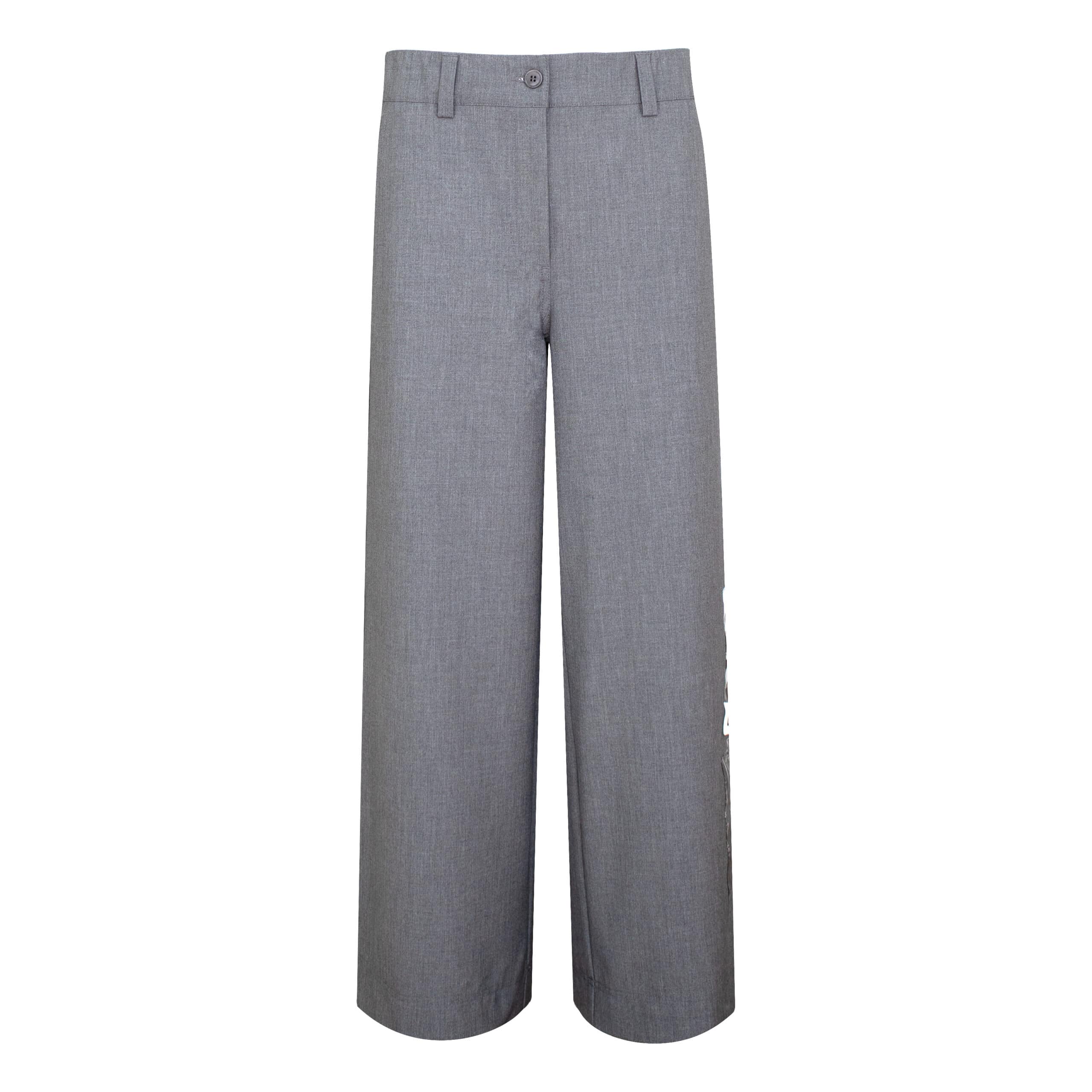 Grijze pantalon van Cambio, model Clementine. Deze 7/8 broek is gemaakt van een grijze stretch stof en heeft wijde broekspijpen met aan de zijkant van een van de broekspijpen patches. De pantalon sluit met een knoop- en ritssluiting, heeft aan de achterzijde een elastische taille, twee steekzakken en twee achterzakken.
