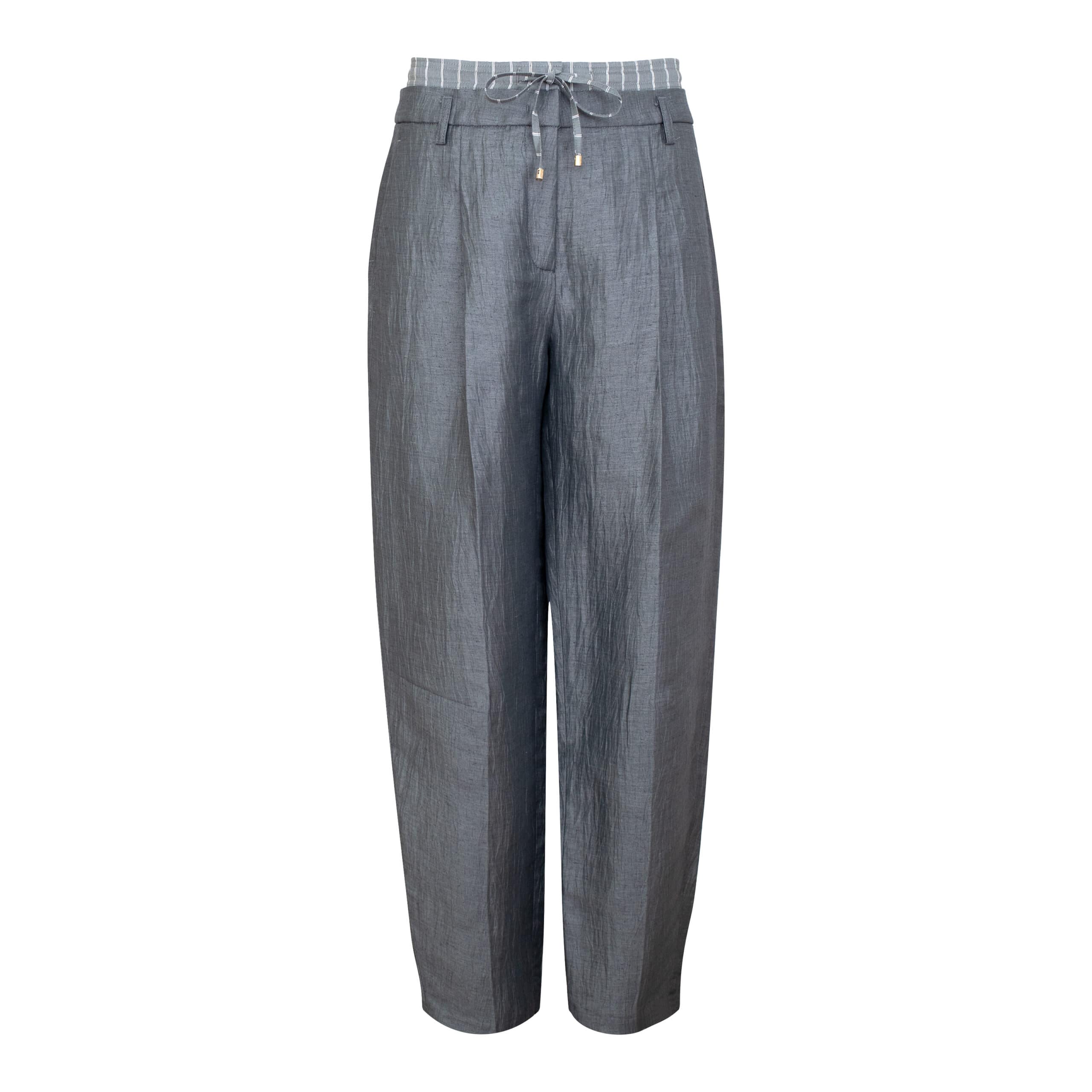 Grijze pantalon van Cambio, model Elaine double waist. Deze pantalon is gemaakt van een grijze, linnen stof met reliëf en heeft een satijnen look. De broek heeft wijde broekspijpen met een lichte ballonvorm die taps toelopen en een hoge taille. De pantalon sluit met een haakje, knoop- en ritssluiting, heeft een dubbele tailleband waarvan de bovenste een trekkoord heeft, twee steekzakken en paspelzakjes.
