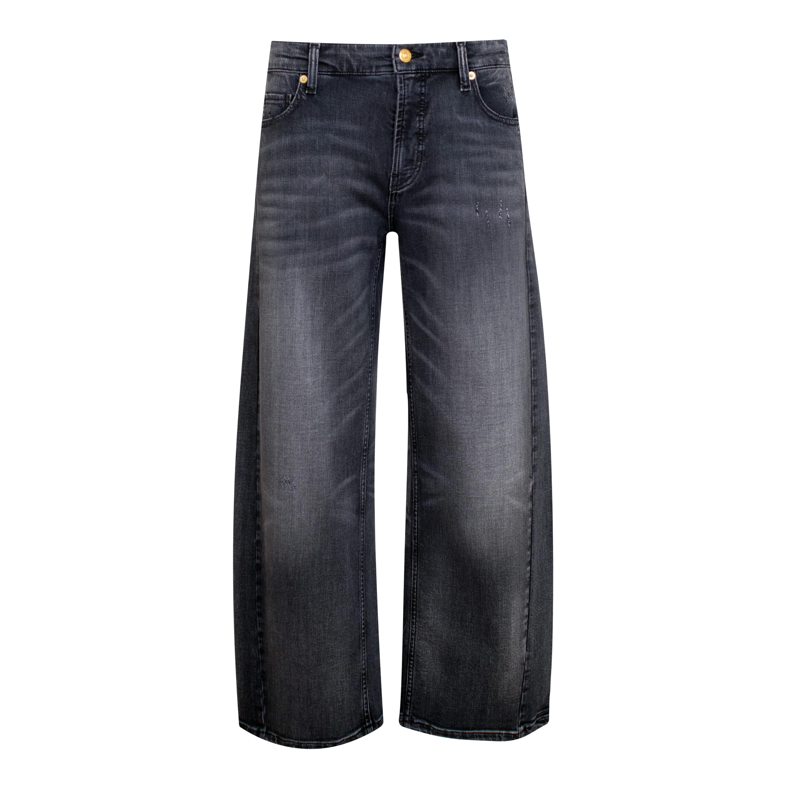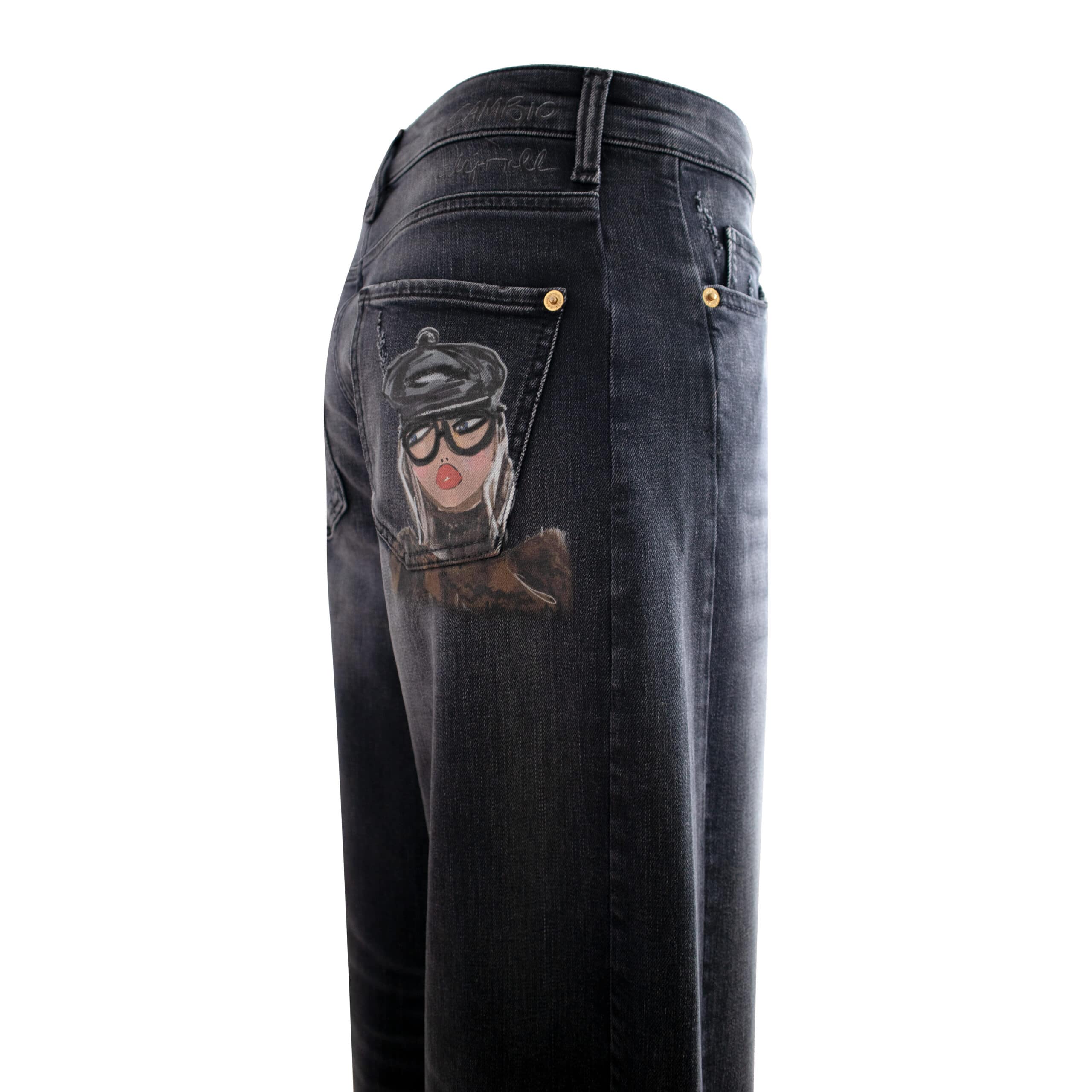 Grijze jeans van Cambio x Lilli Grill, model Oria. Deze broek is gemaakt van een denim stretch stof met lichte beschadigingen en heeft barrel broekspijpen. De pantalon sluit met een knoop- en ritssluiting, heeft een hoge taille, twee steekzakken en achterzakken waarvan er een versiert is met een tekening van Lilli Grill.