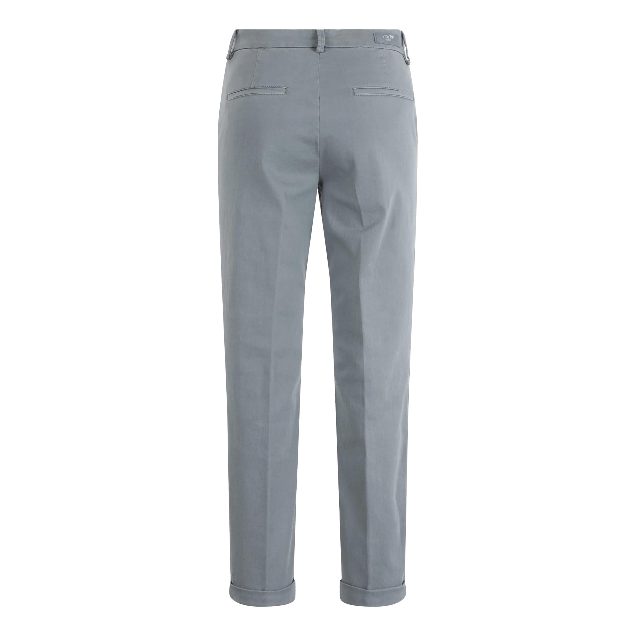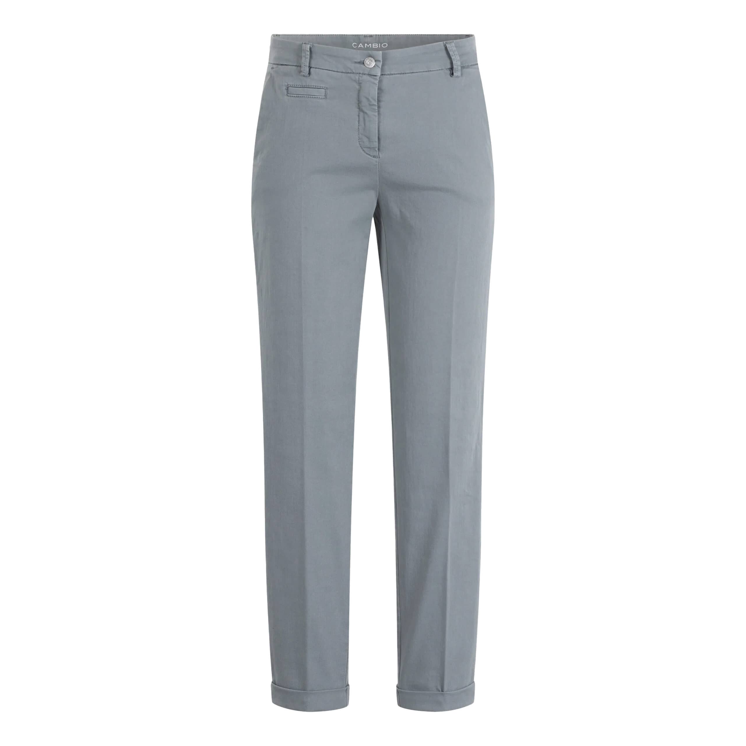 Grijze pantalon van Cambio, model Stella. Deze broek heeft toelopende broekspijpen met een vaste omslag en een medium taille. De broek is gemaakt van katoenen stretch stof, heeft twee steekzakken en twee sier paspelzakjes aan de achterzijde.