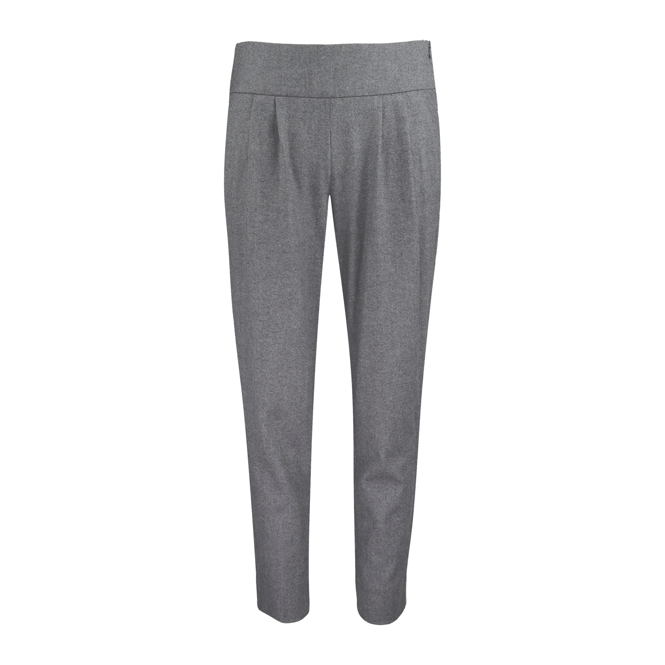 Grijze pantalon van Cambio, model Julle. Deze pantalon is gemaakt van een wol mix en heeft toelopende broekspijpen met streekzakken. De pantalon sluit met een verborgen ritssluiting aan de zijkant en is geplooid aan de tailleband.