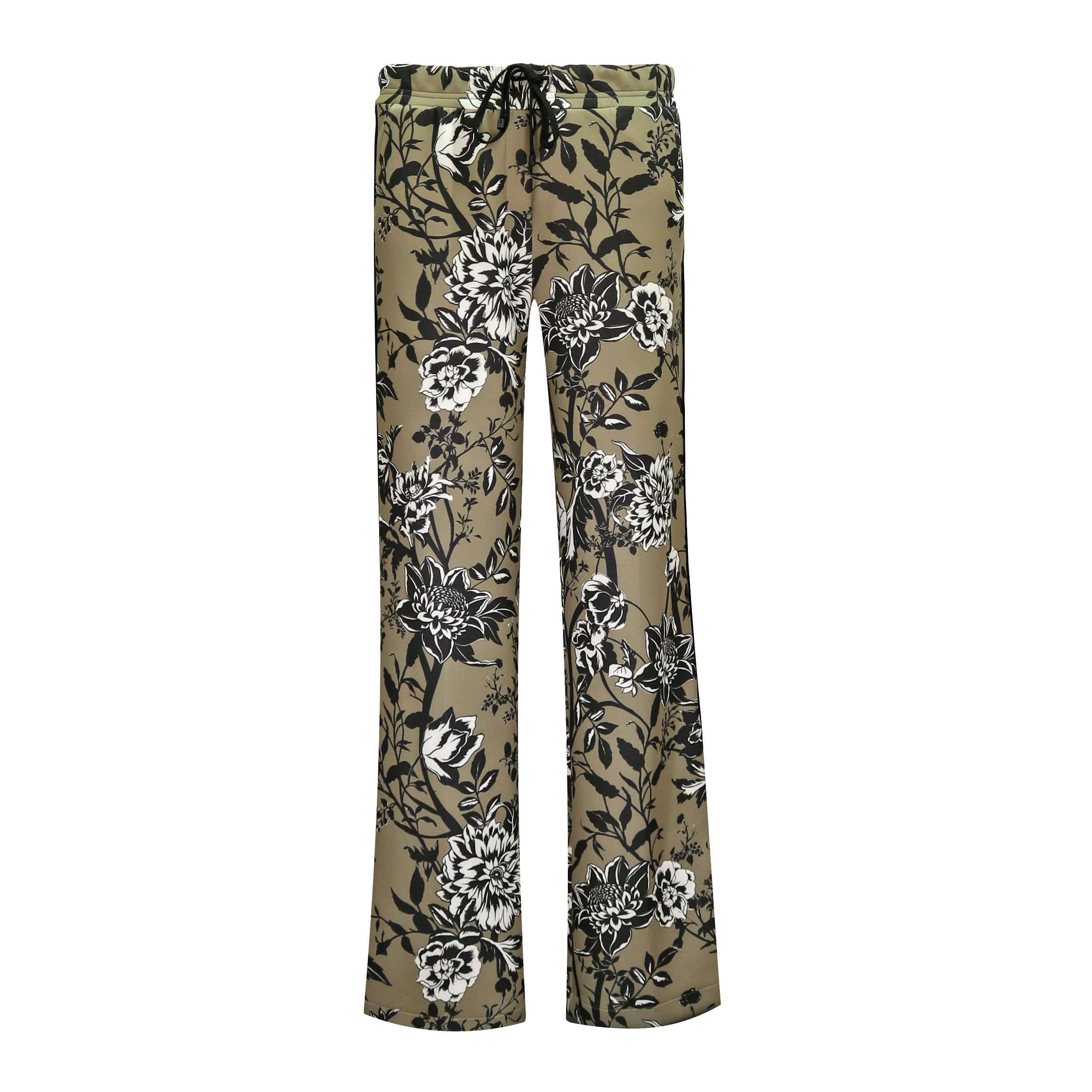 Bruin, groene pantalon van Cambio. Deze relaxte broek is gemaakt van jogging stof met stretch en heeft een bloemenprint, een zwarte bies aan beide zijkanten en lange, rechte, losvallende broekspijpen. De pantalon heeft een elastische taille met trekkoord en twee steekzakken.