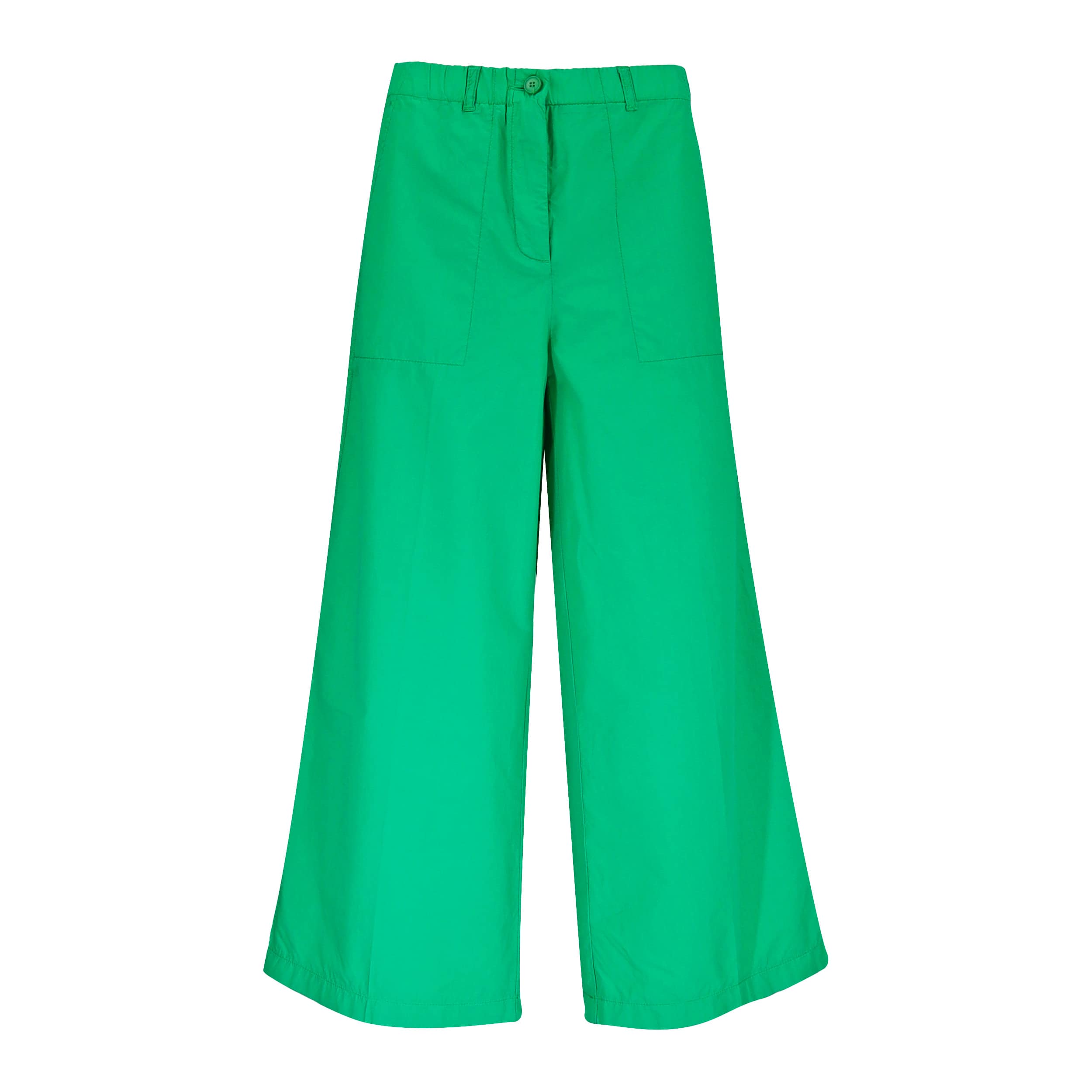 Groene culotte pantalon van Cambio. Deze 7/8 broek is gemaakt van dunne katoenen stof, heeft een normale elastische taille en wijde broekspijpen. De pantalon sluit met een haakje, knoop- en ritssluiting, heeft twee steekzakken en twee sier paspelzakken.