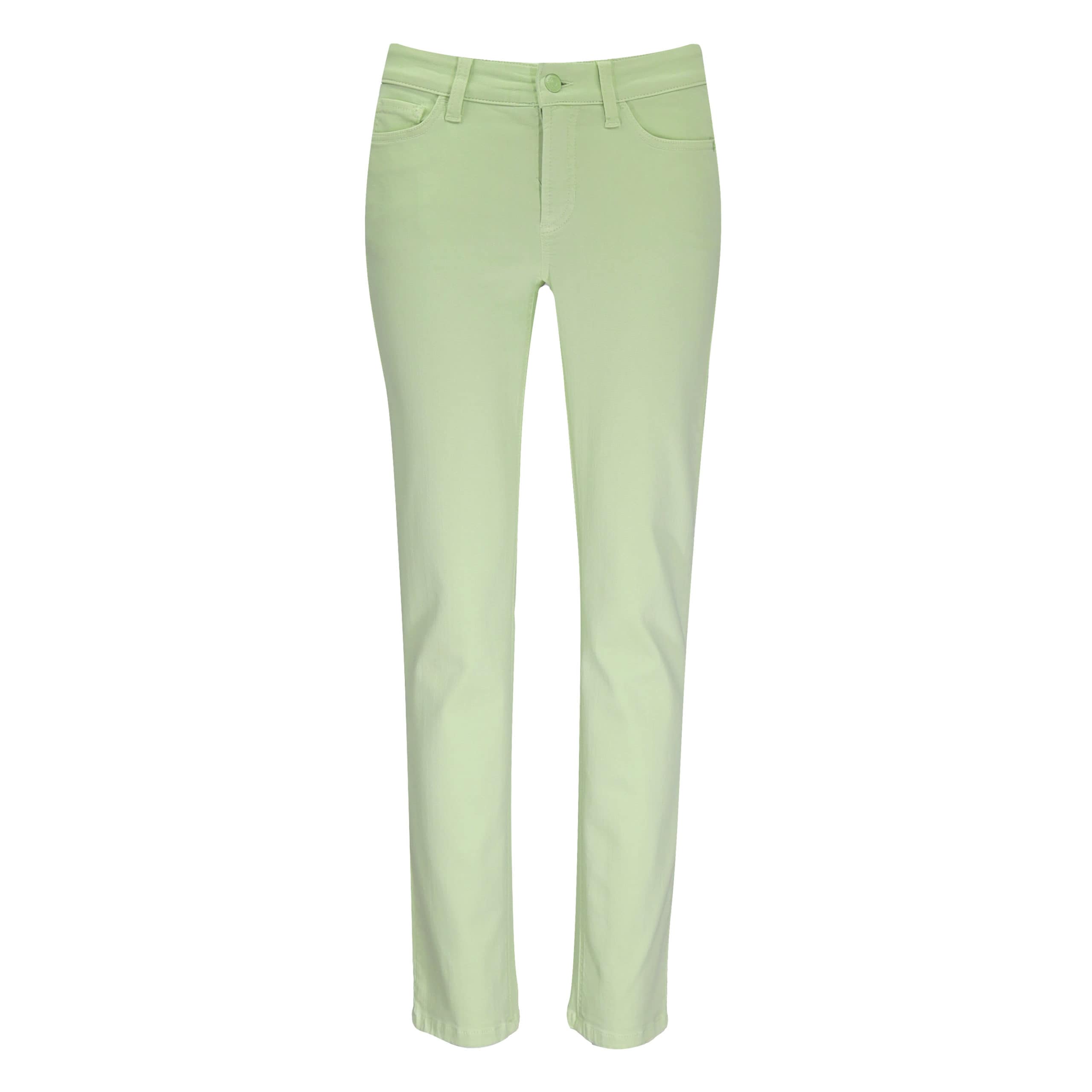 Lichtgroene jeans van Cambio, model Piper Cropped. Deze katoenen broek heeft een slim fit pasvorm met een normale taille. De broek valt tot net boven de enkels en sluit met een knoop- en ritssluiting.