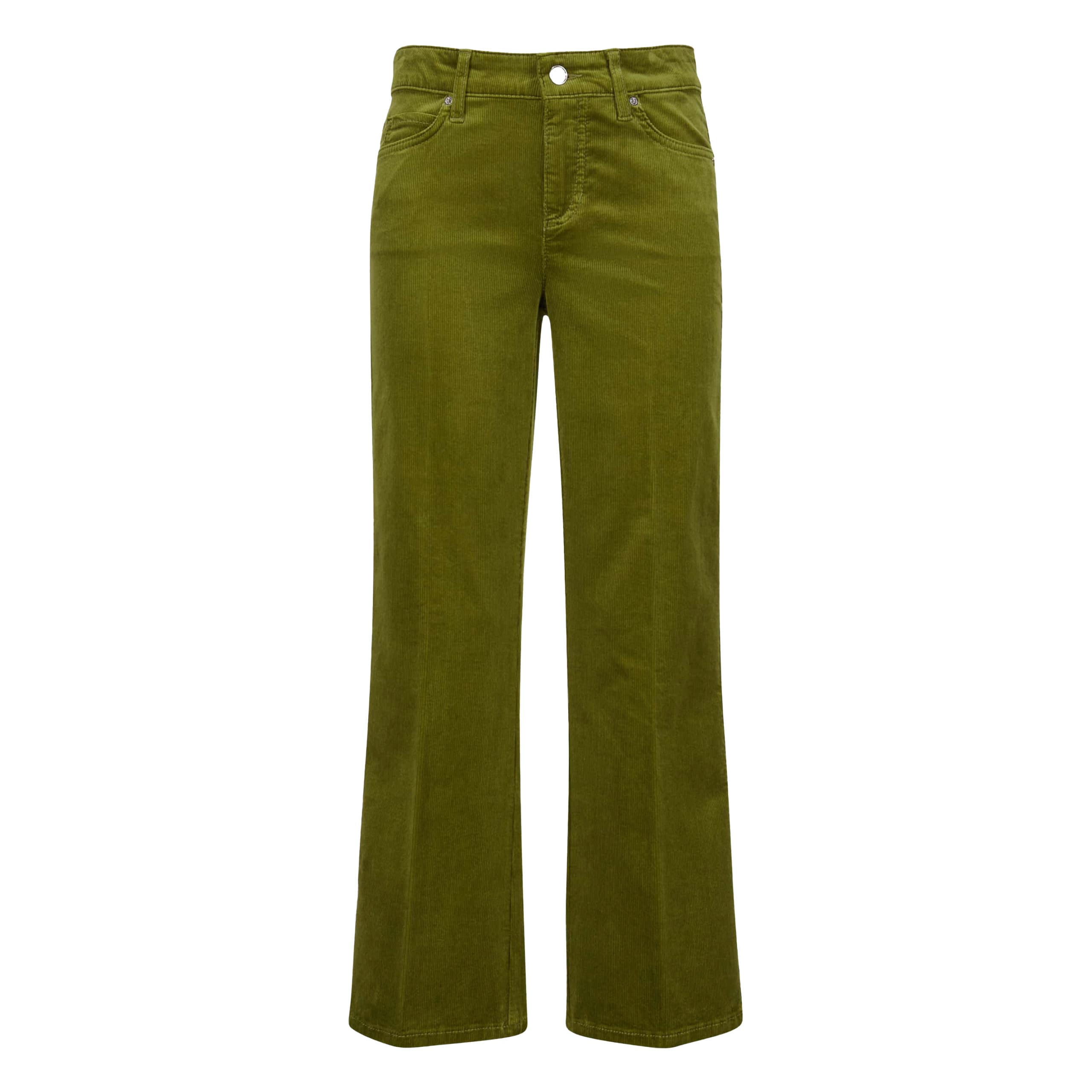 Corduroy pantalon van Cambio, model Francesca. Deze mos groene 7/8 broek is gemaakt van ribfluwelen stof en heeft rechte wijde broekspijpen. De broek sluit met een knoop- en ritssluiting, heeft twee steekzakken en twee achterzakken.