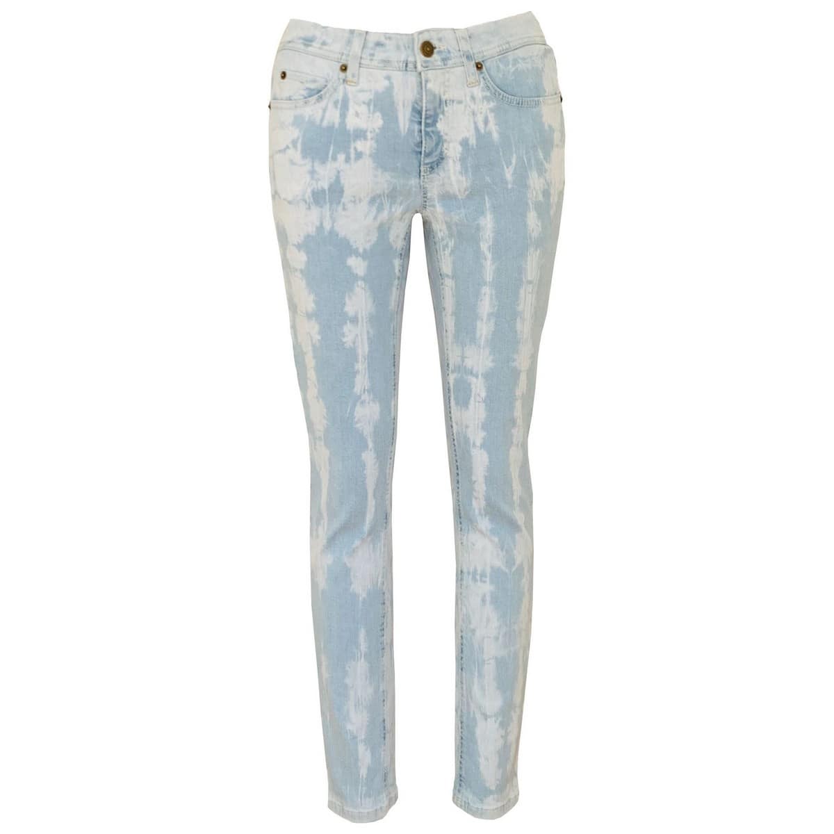Comfortabele jeans van Cambio, model Parla. Deze skinny jeans heeft een normale taille, twee steekzakken aan de voorzijde en twee achterzakken. De gehele broek heeft een blauwe basis met een gebleekte tie dye motief.