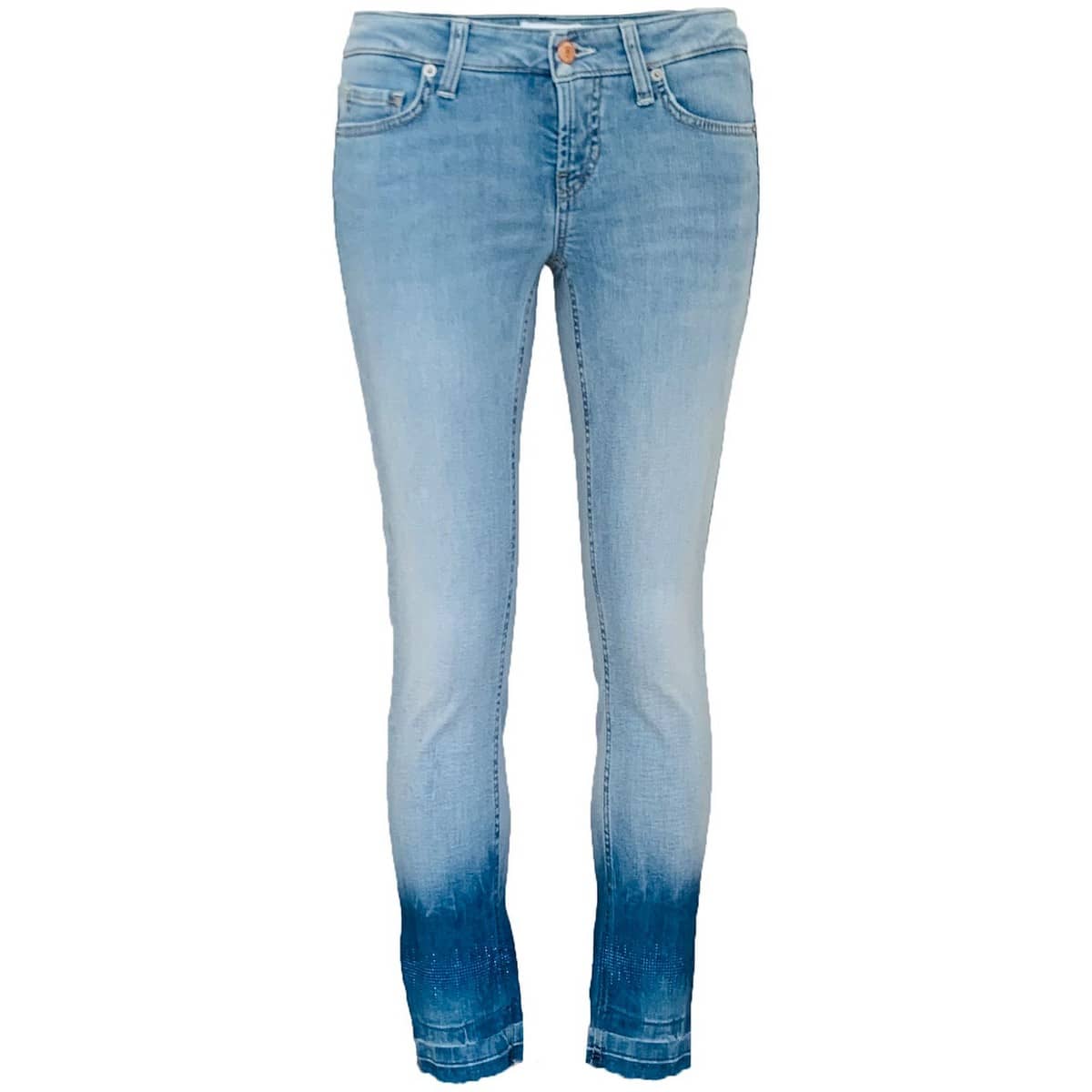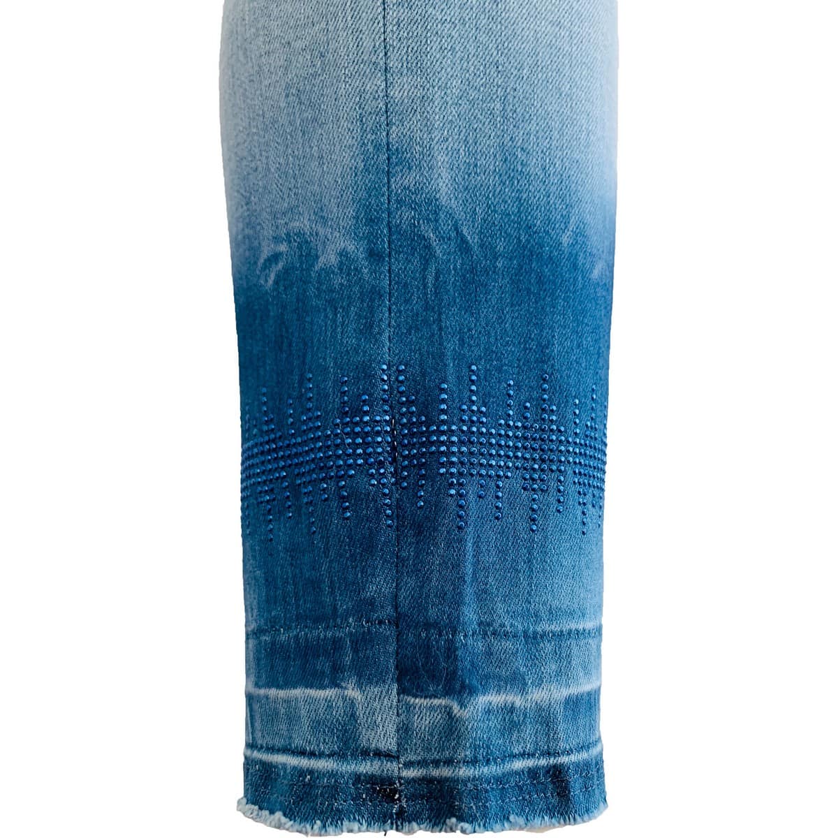 Aansluitende jeans van Cambio, model Liu Short in summer lifely used + open hem. Deze broek heeft een summer lifely used wassing en een geraffelde zoom. Aan de onderkant van de broekspijpen zijn blauwe decoratieve steentjes aangebracht. De jeans valt tot net boven de enkels.