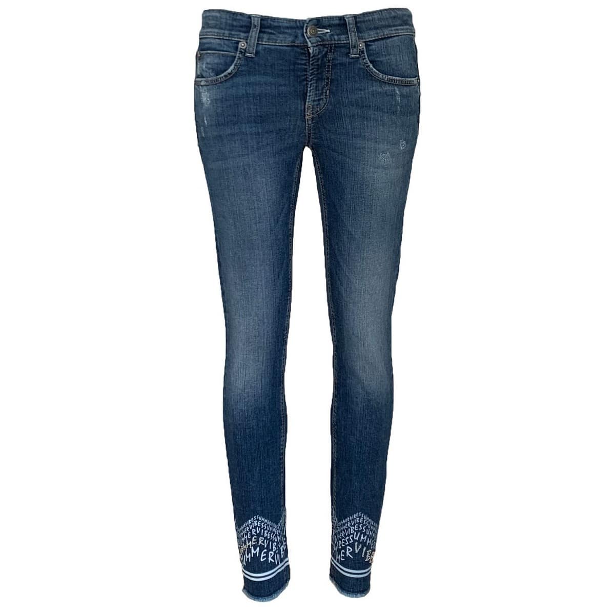 Skinny jeans van Cambio, model Pina. De jeans heeft een medium taille, twee steekzakken en twee achterzakken. Deze blauwe denim broek heeft een lichte beschadigingen en een licht gerafelde zoom. Aan de onderzijde van de broekspijpen staan de woorden summer vibes. De ene broekspijp heeft  summer in zilveren studs en de andere heeft vibes in zilveren studs.