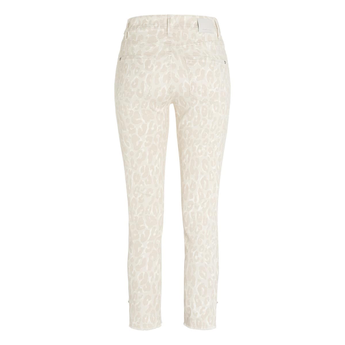 Skinny jeans van Cambio, model Parla Ancle Cut. Deze broek heeft een ecru basis met een subtiele luipaarden print. De jeans heeft een skinny pasvorm, valt tot net boven de enkels en heeft kleine rafels aan de onderzijde van de broekspijpen.