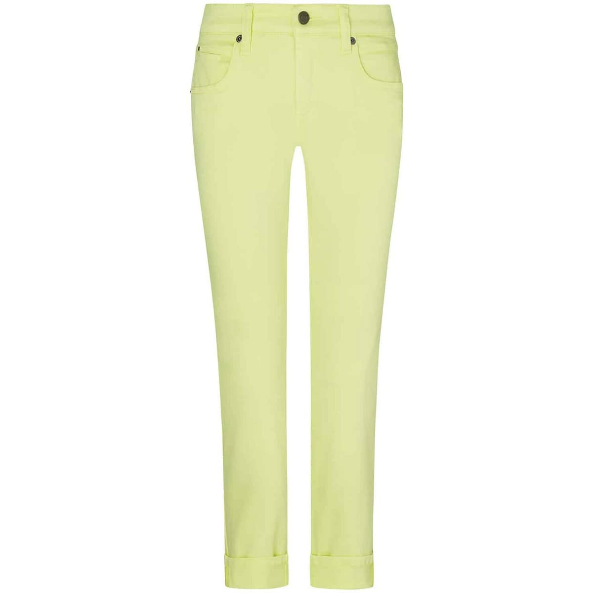 Slim fit jeans van Cambio, model Pina Short. Deze denim broek is effen geel en valt net boven de enkels. De jeans heeft een medium taille, twee steekzakken en twee achterzakken.