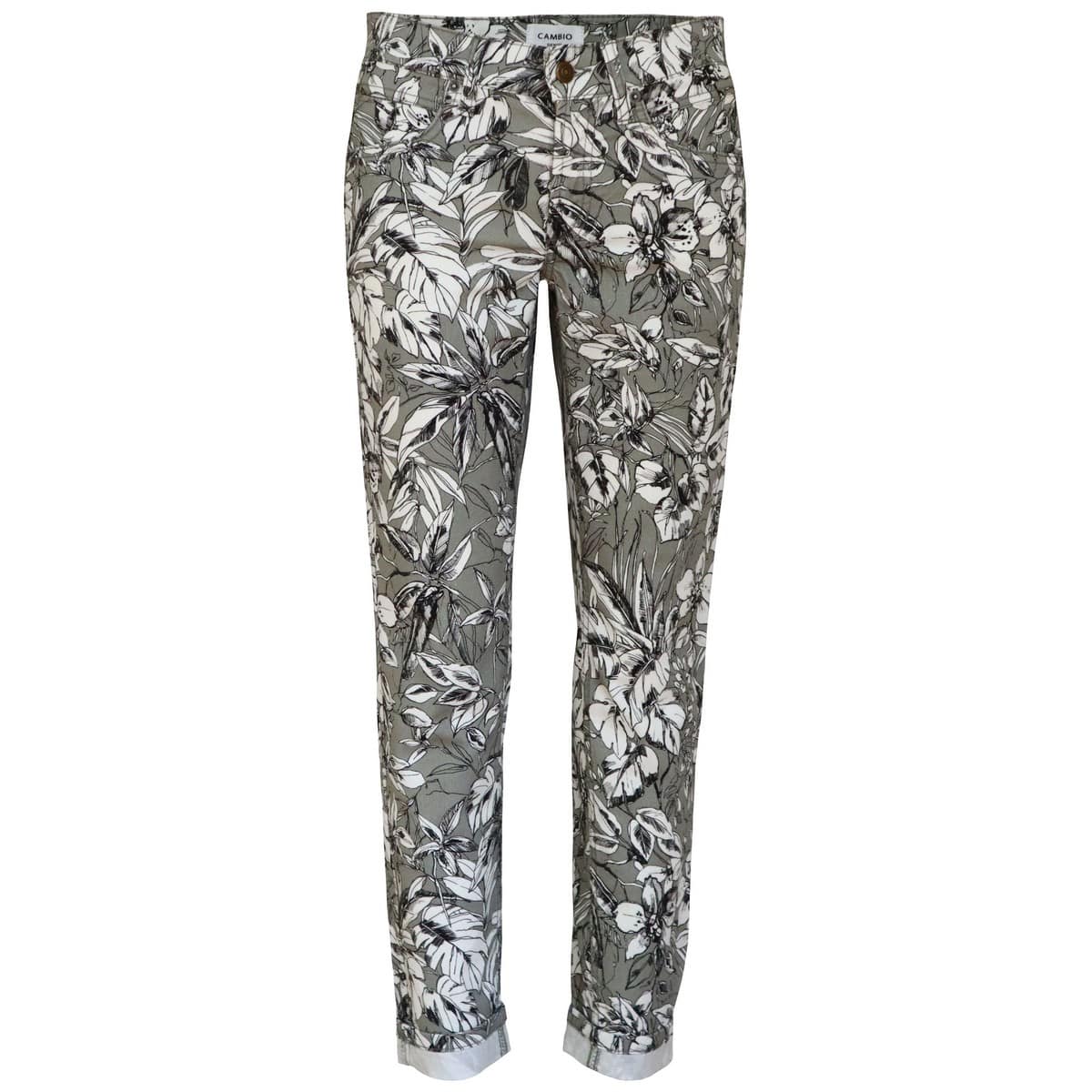 Slim fit jeans van Cambio, model Pina in green scribbled flower. Deze grijze denim broek met witte bloemen heeft een klassieke pasvorm. De jeans heeft een medium taille, twee steekzakken en twee achterzakken.