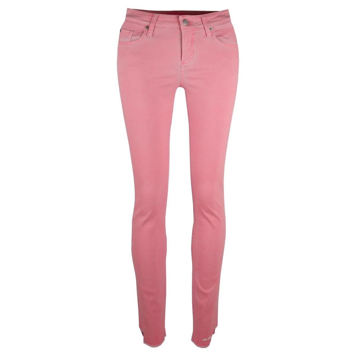 Skinny jeans van Cambio. Deze broek heeft een neon roze basis met een gebleekte wassing. De jeans broek heeft een skinny pasvorm met een lage taille, twee steekzakken, een muntzakje en twee achterzakken. Aan de onderzijde van de broekspijpen zijn gerafeld en ingesprongen.