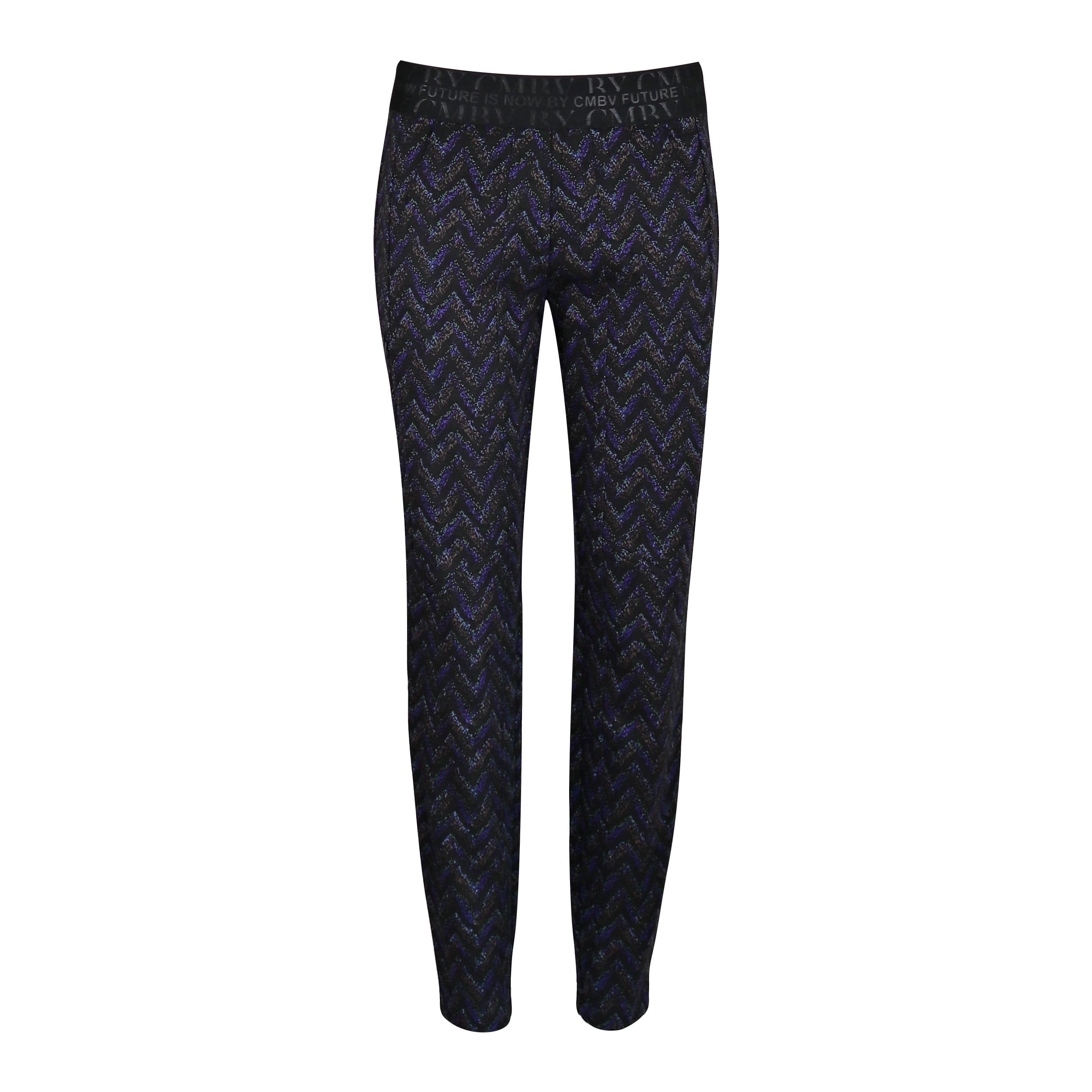 Relaxte pantalon van Cambio, model Jorden Pure. Deze broek heeft een zwarte elastische taille, taps toelopende broekspijpen, twee steekzakken en twee sier paspel zakken aan de achterzijde. De broek is gemaakt van een zwart stretch stof met een gekleurd zigzag patroon.