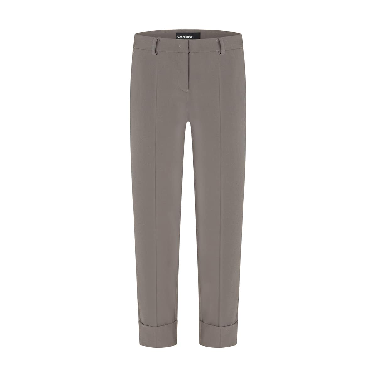 Bruin groeen pantalon van Cambio, model Krystal in volcanic khaki. Deze broek is gemaakt van een jersey stretch stof, heeft iets toelopende broekspijpen en een 7/8 lengte met een vaste omslag. De pantalon sluit met een haakje, knoop- en ritssluiting en heeft twee steekzakken en twee sier paspelzakjes.