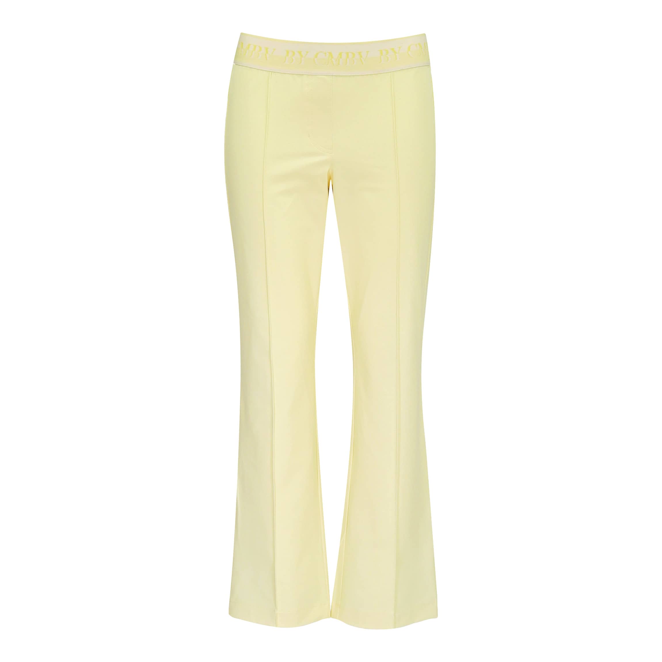 Slim fit flared broek van Cambio, model Ranee easy kick. Deze relaxte broek is gemaakt van een gladde licht gele stretch stof. De broek heeft een elastische tailleband en licht uitlopende broekspijpen met een vaste naad aan de voorzijde.