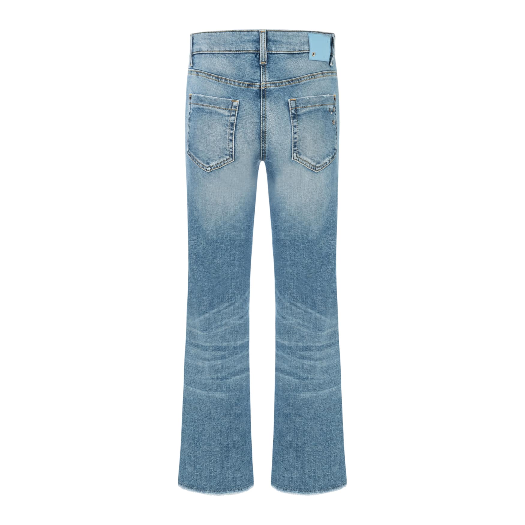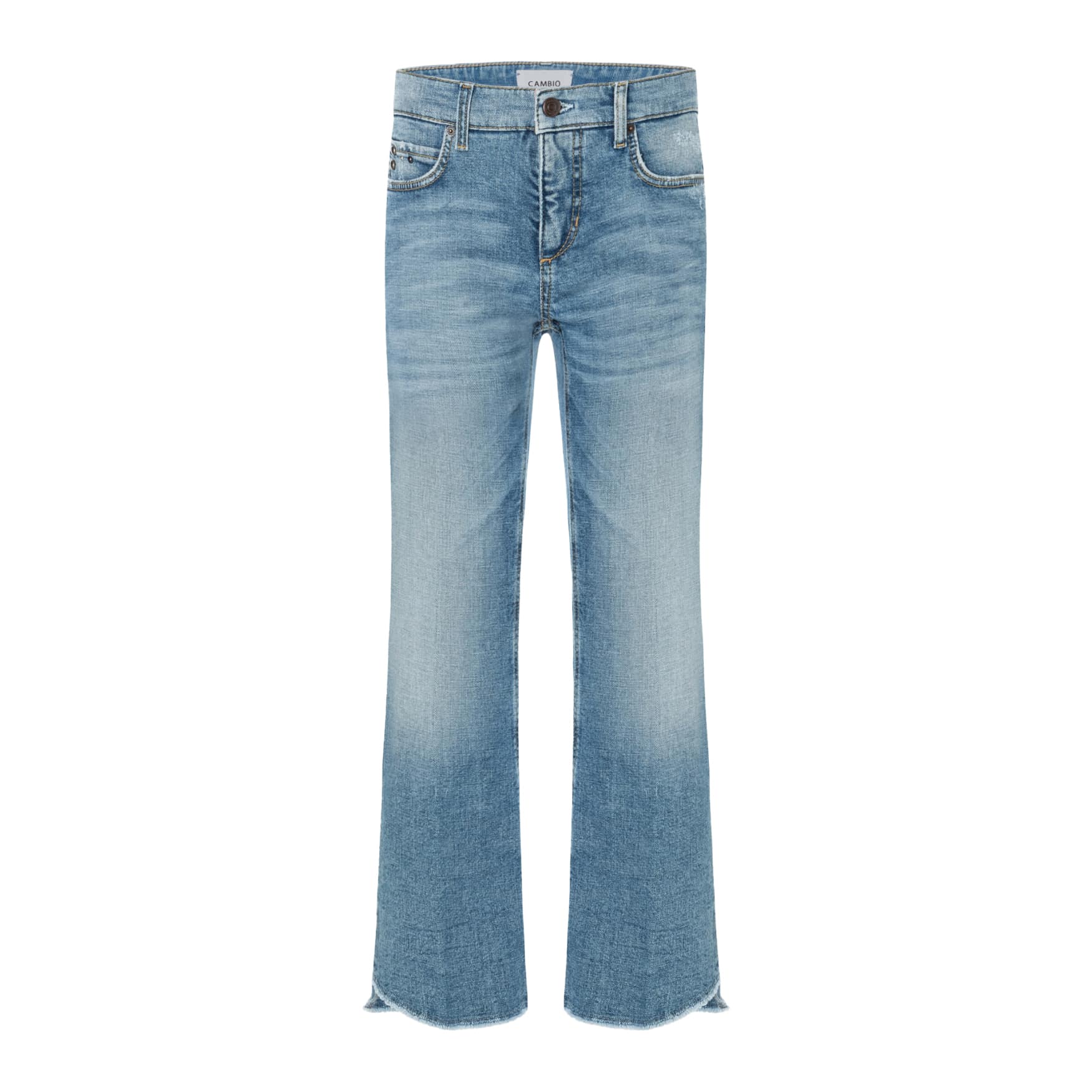 Lichtblauwe jeans van Cambio, model Fenja in cross contrast bleached. Deze spijkerbroek is gemaakt van stretch denim met een used wassing en heeft een regular pasvorm met een normale taille en uitlopende broekspijpen met fijne rafels. De jeans sluit met een knoop- en ritssluiting, heeft twee steekzakken en twee achterzakken met decoratieve zilveren studs.