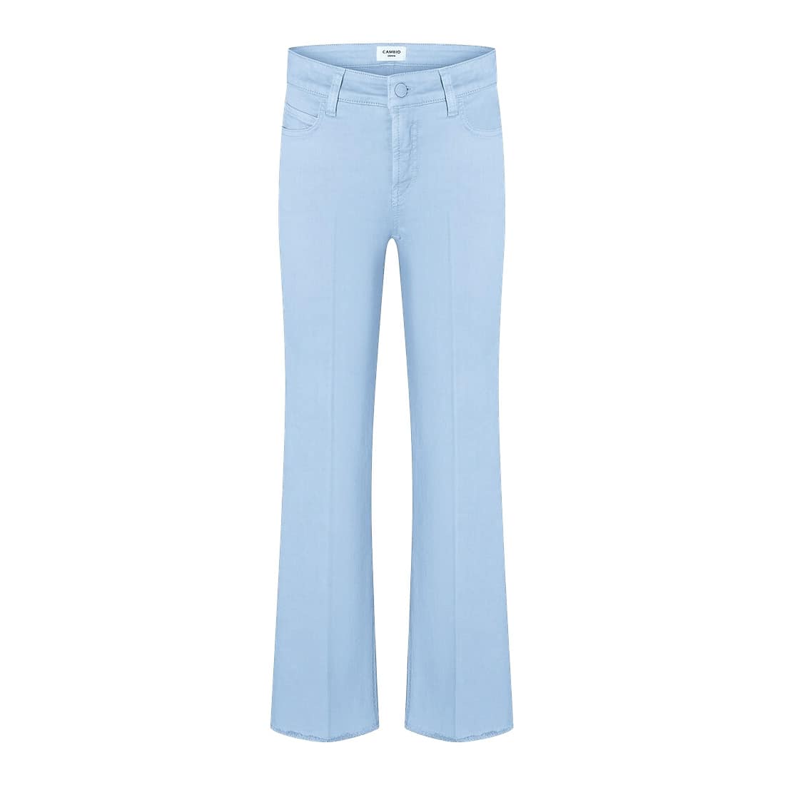 Lichtblauwe jeans van Cambio, model Francesca. Deze lichtblauwe broek is gemaakt van stretch denim en heeft rechte, wijde broekspijpen die aan de onderzijde iets uitlopen met fijne rafels. De broek sluit met een knoop- en ritssluiting, heeft twee steekzakken en twee achterzakken.