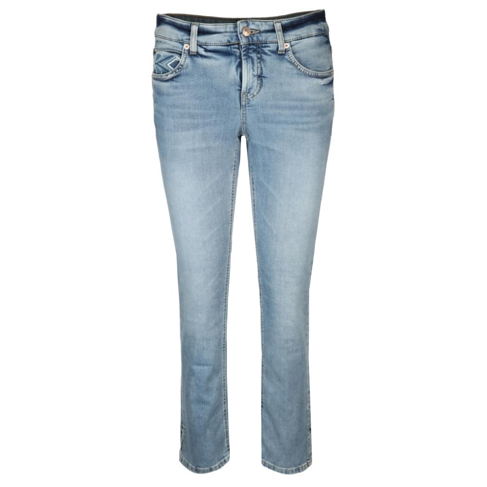 Lichtblauwe jeans van Cambio, model Tess Straight Short in eco salty mid used. Deze broek heeft is gemaakt van een denim stretch stof en valt tot boven de enkel. De jeans sluit met een knoop- en ritssluiting, heeft twee steekzakken en twee achterzakken. Aan de onderzijde van de broekspijpen is de broek ingesneden en voorzien van een zilveren stud.