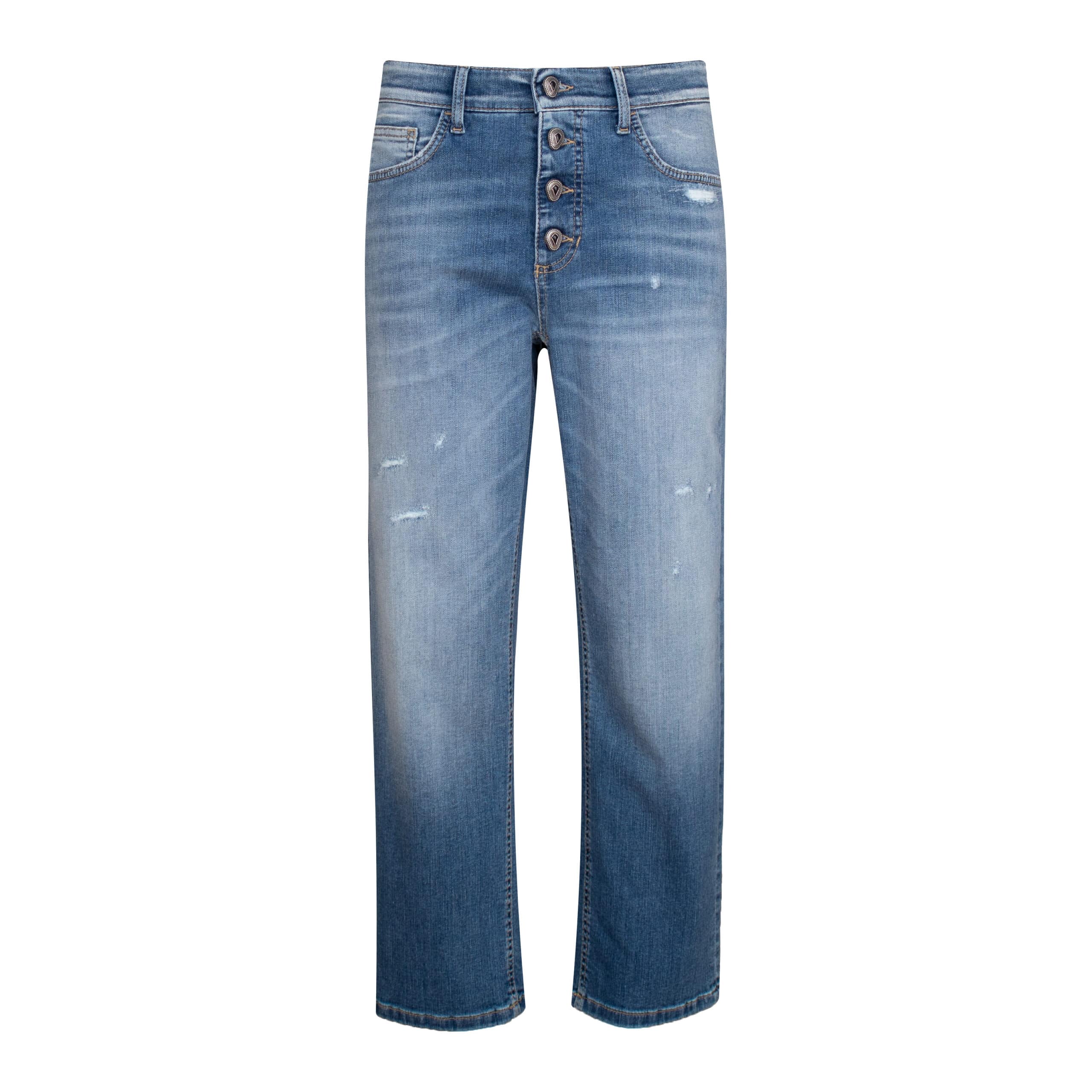 Relaxte jeans van Cambio, model Kimberley in cozy modern distressed. Deze spijkerbroek is gemaakt van een blauwe denim stretch stof met beschadigingen. De cropped carrot-fit jeans sluit met een zichtbare knoopsluiting, heeft twee steekzakken en twee achterzakken.