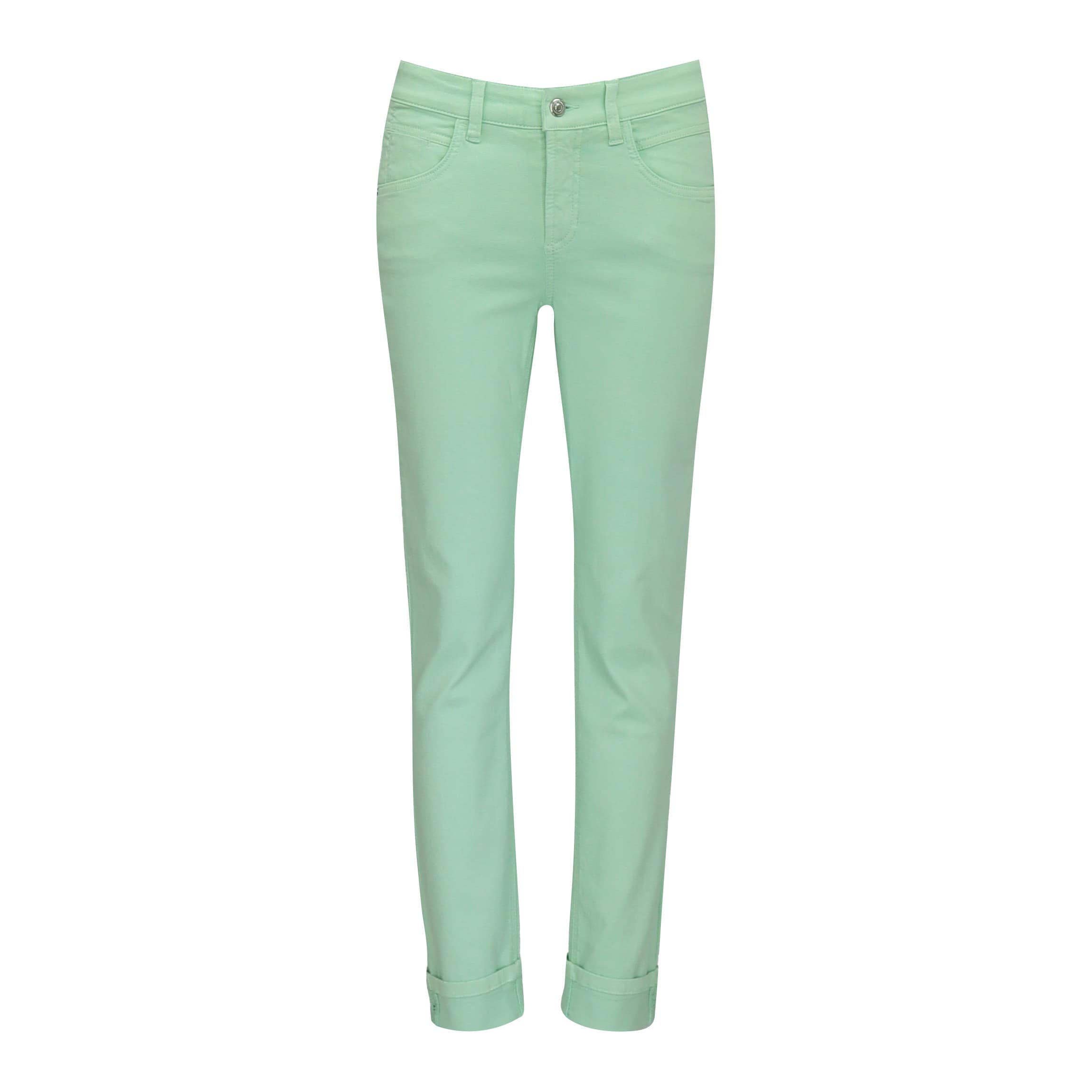Slim fit jeans van Cambio in lichtgroen. Deze broek is gemaakt van denim stretch stof en heeft een vaste omslag aan de onderzijde van de broekspijpen. De jeans sluit met een knoop- en ritssluiting, heeft twee steekzakken en twee achterzakken.