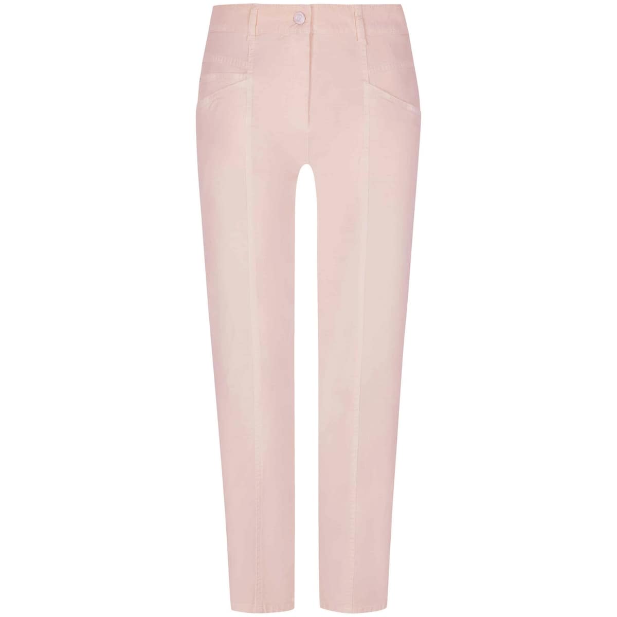 Lichtroze broek van Cambio, model Klementine. Deze broek heeft een hoge taille, een losse pasvorm en valt tot boven de enkels. De broek sluit met een knoop- en ritssluiting en heeft aan de voorzijde twee steekzakken en twee achterzakken.