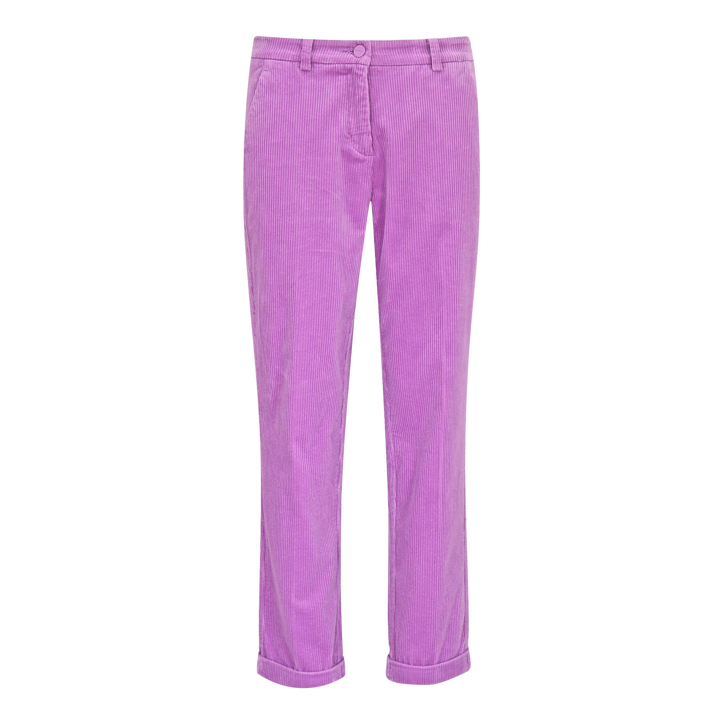 Lila ribfluwelen pantalon van Cambio, model Krystal. Deze katoenen broek heeft iets toelopende broekspijpen en een 7/8 lengte met een vaste omslag. Aan de voorzijde zitten twee steekzakken en aan de achterzijde zitten twee sier paspelzakjes.