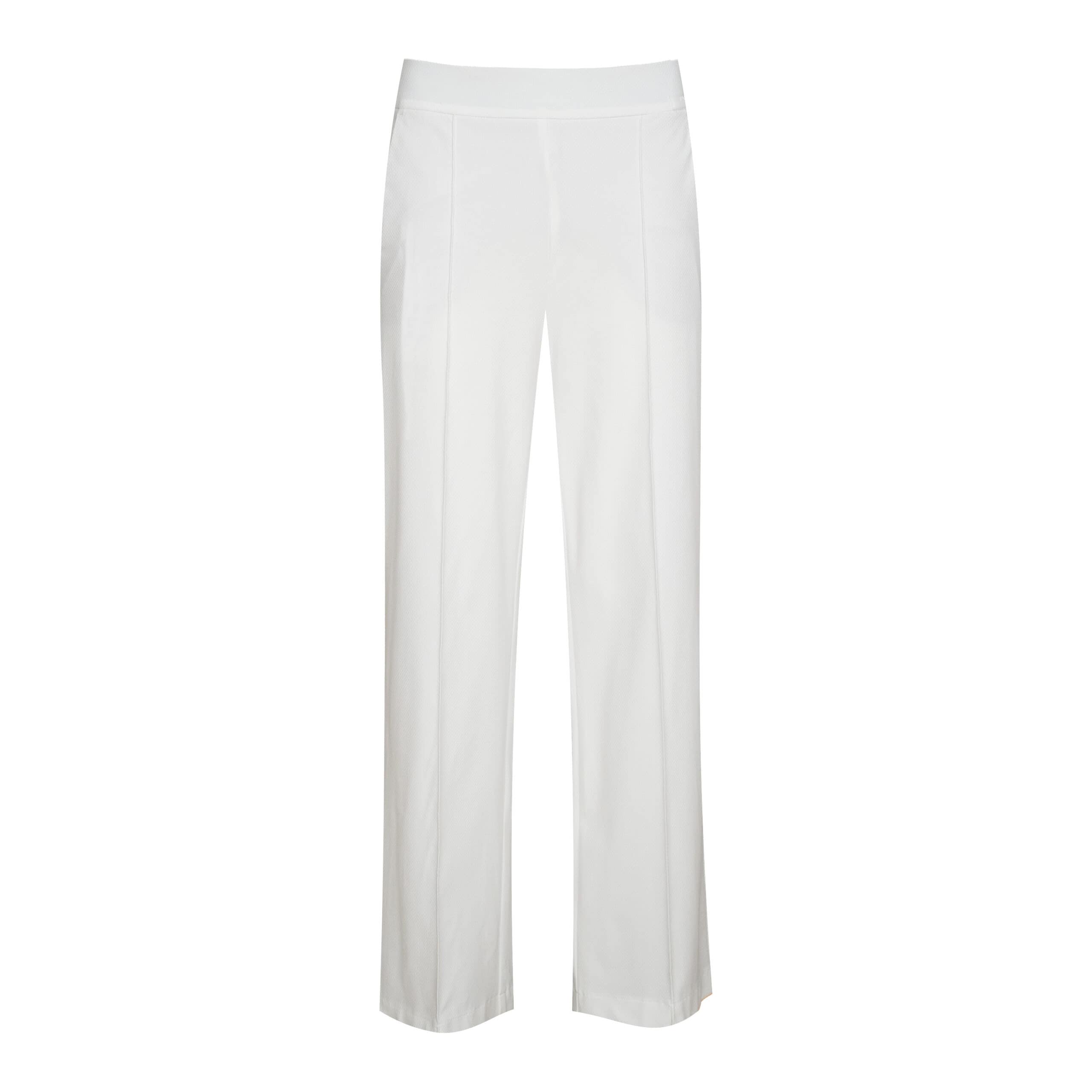 Off white pantalon van Cambio. Deze pantalon is gemaakt van een off white stretch stof met reliëf en heeft een vast naad aan de voorzijde van de broekspijpen. De broek heeft een normale, elastische taille, rechte broekpijpen en twee steekzakken en twee sier paspelzakken.