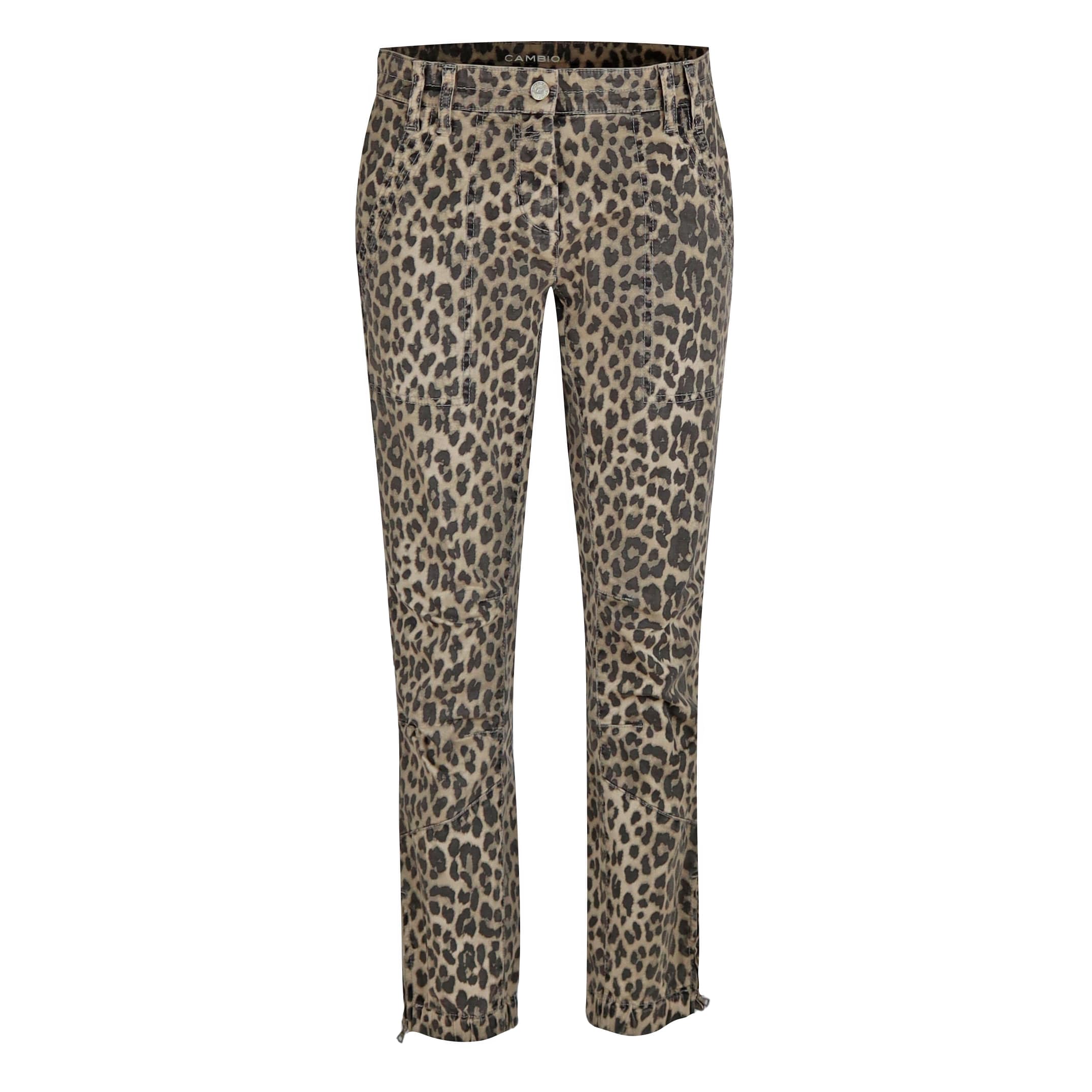Katoenen broek met stretch van Cambio, model Lotta Utility in luipaard print. Deze broek sluit met een knoop- en ritssluiting, heeft twee grote steekzakken aan de voorzijde en twee achterzakken. Aan de onderzijde van beide broekspijpen zitten ritsjes.