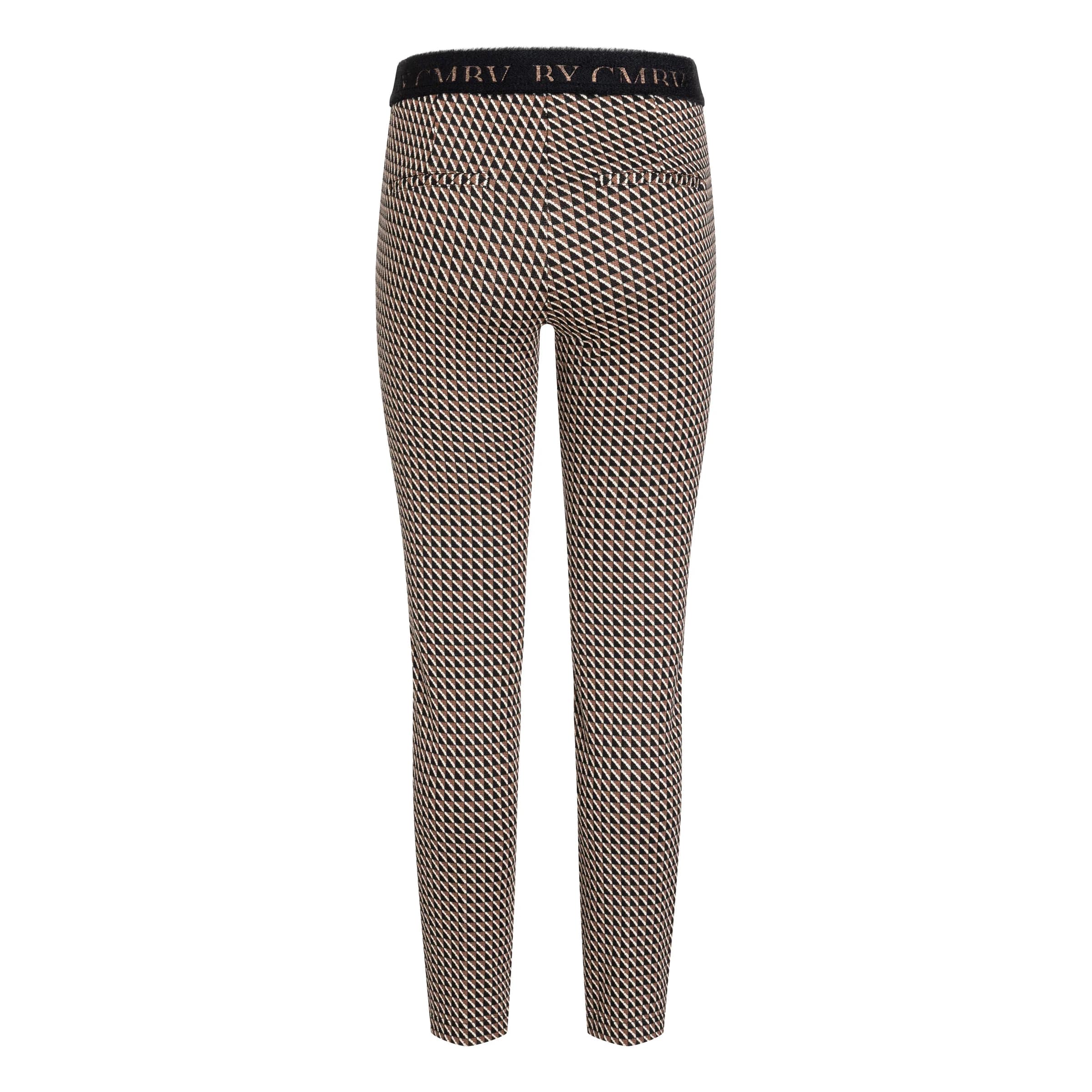 Pantalon van Cambio, model Ros. Deze broek heeft een print van bruin, zwarte blokjes met een witte schuine streep. De pantalon heeft een zwarte elastische tailleband, tapstoelopende broekspijpen met een ritsje aan de onderzijde, normale taille, vaste naad aan de voorzijde en twee sier paspelzakjes aan de achterzijde.