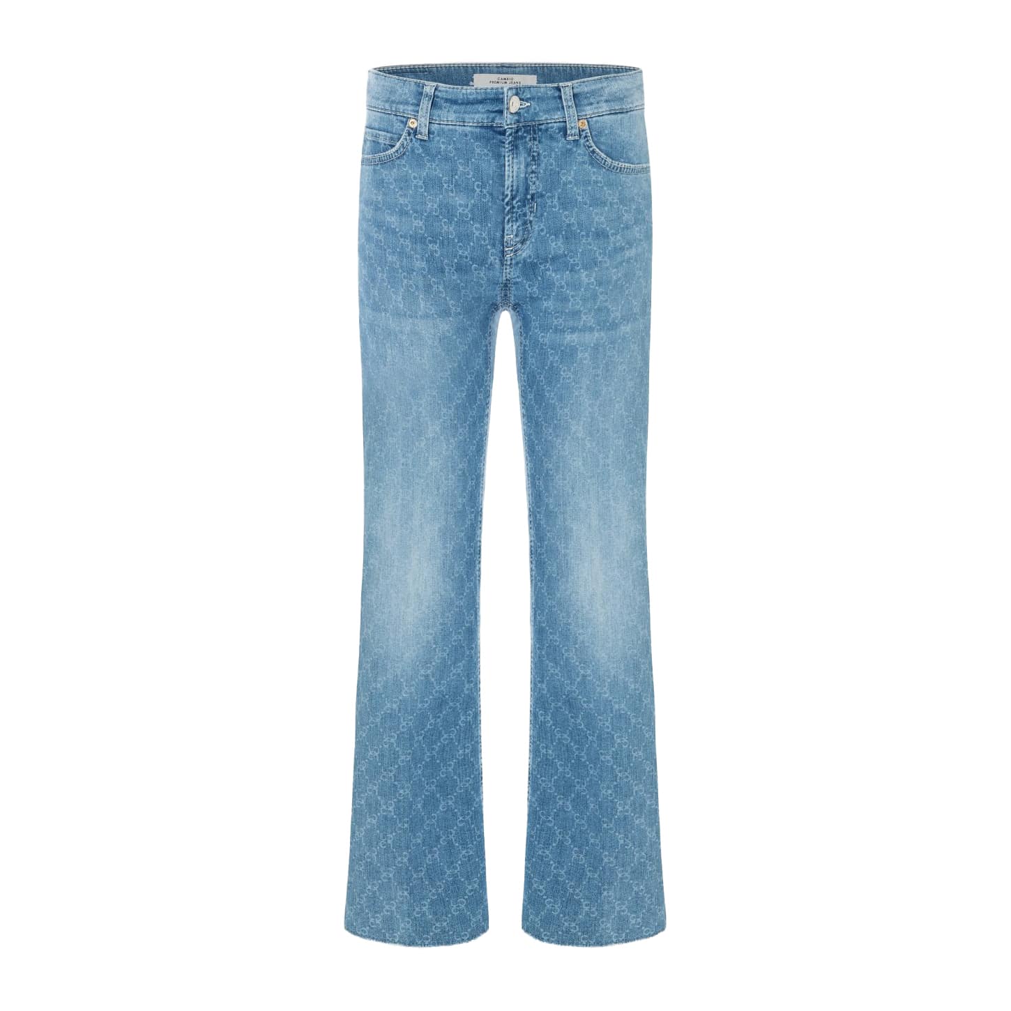 Blauwe jeans van Cambio, model Paris Easy Kick in allover minimal laser. Deze spijkerbroek is gemaakt van stretch denim en heeft een allover gelaserde print, bootcut pasvorm en medium taille. De jeans sluit met een knoop- en ritssluiting, heeft aan de voorzijde twee steekzakken en twee achterzakken.