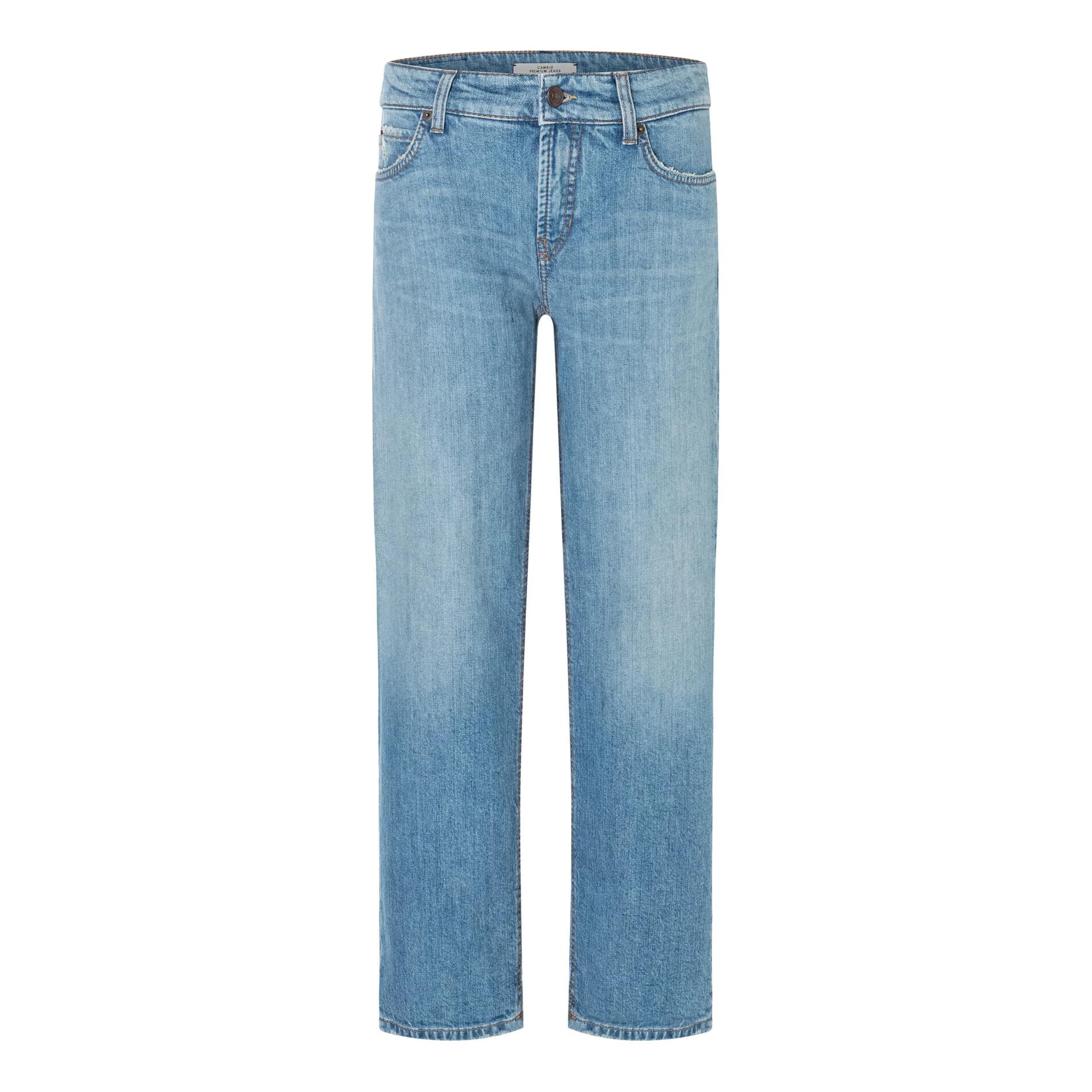 Blauwe jeans van Cambio, model Paris Straight Ancle in slubby grinded. Deze broek is gemaakt van stretch denim met een used look, heeft een rechte pasvorm en een medium taille. De jeans sluit met een knoop- en ritssluiting, heeft twee steekzakken en twee achterzakken.