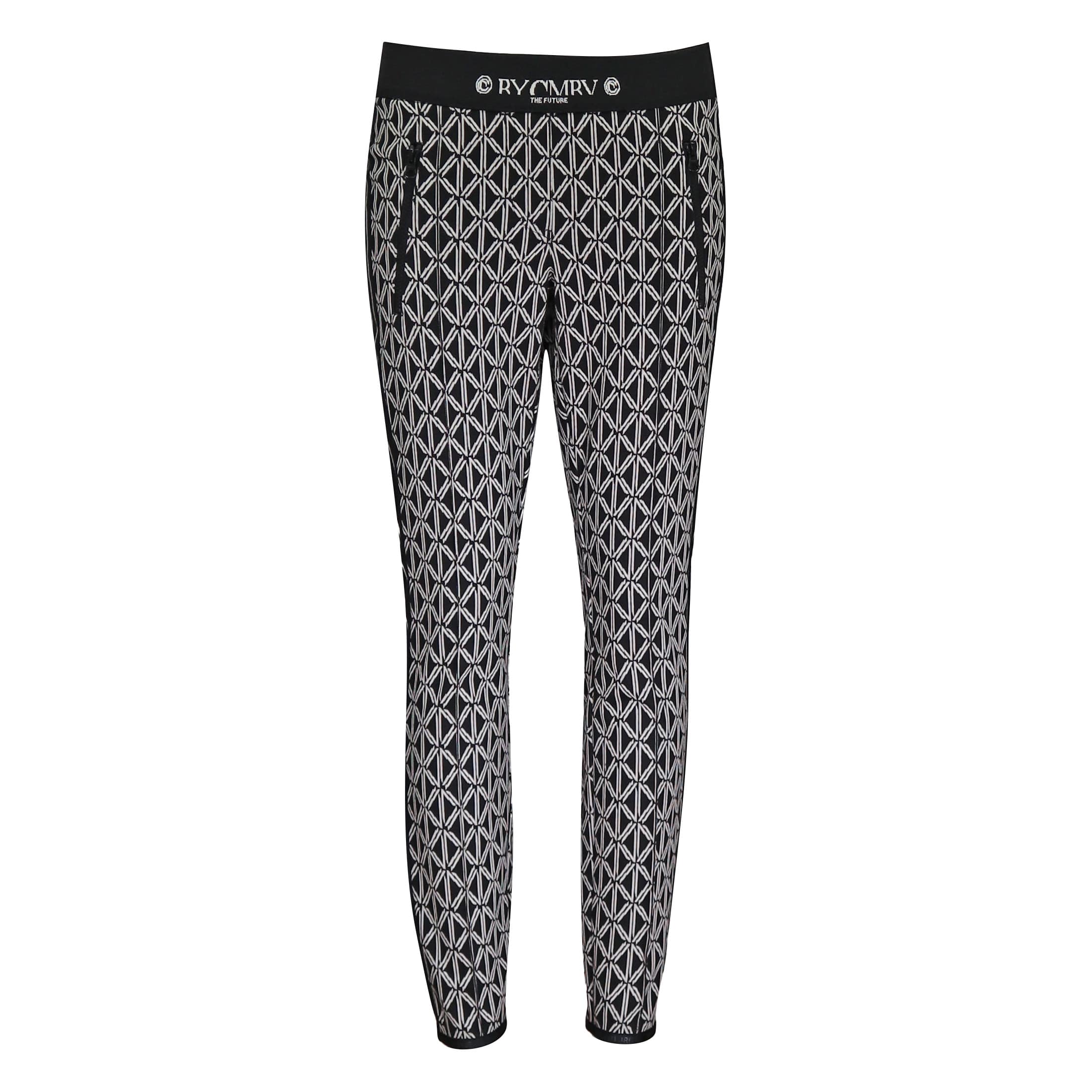 Aansluitende broek van Cambio, model Ranee Galon. Deze broek is gemaakt van jersey stretch stof en heeft een all over zwarte witte print met een zwarte bies aan de zijkant met de woorden future by Cmbv. De broek heeft aan de voorzijde twee steekzakken met een rits, elastische tailleband en een vaste naad in de broekspijpen met aan de onderzijde ritsjes.