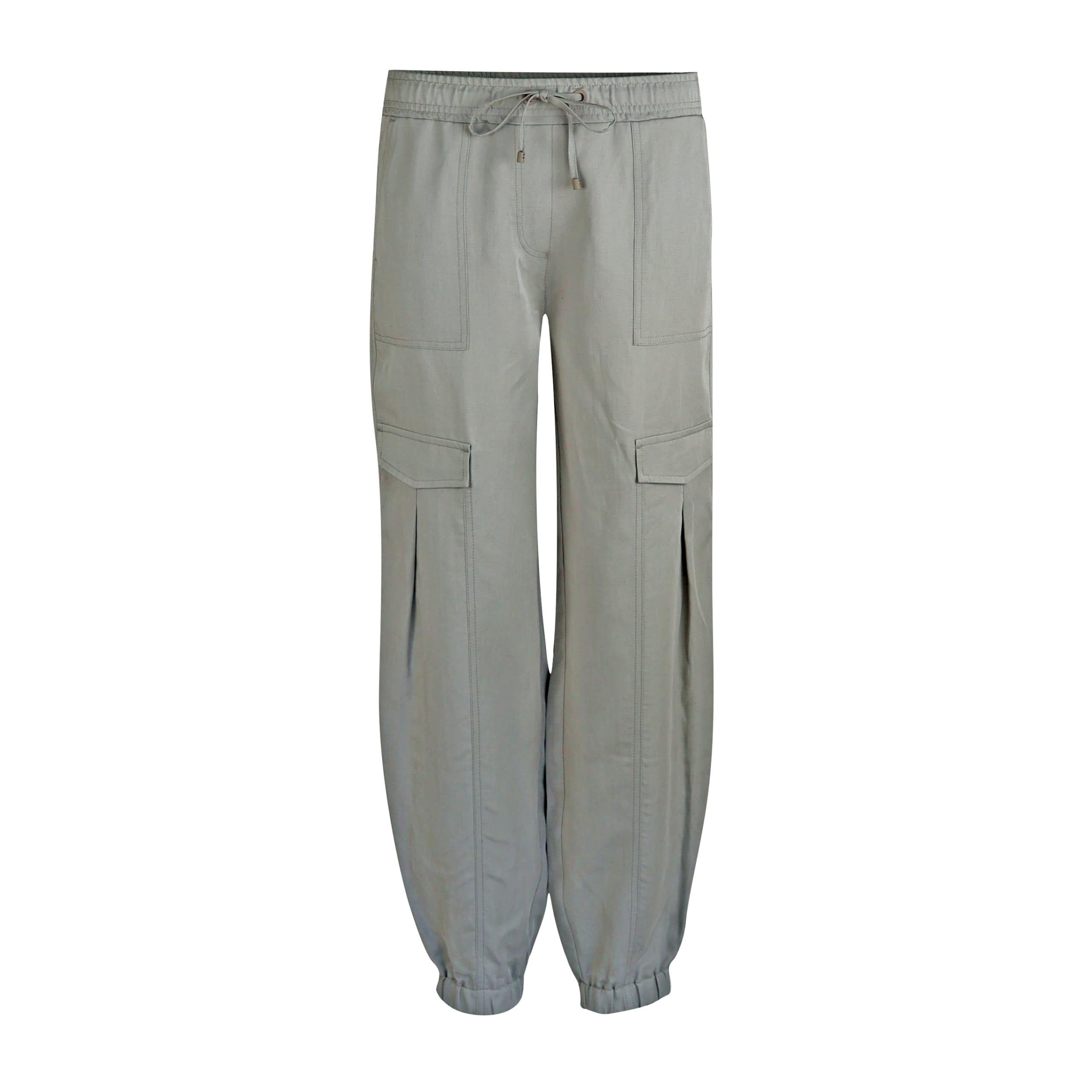 Grijs groene pantalon van Cambio. Deze losvallende broek heeft twee steekzakken, twee sier cargo zakken, twee sier paspelzakken en een elastische taille met trekkoord. De pantalon is gemaakt van een lyocell met linnen mix, heeft een normale taille, relaxte pasvorm en een elastische zoom aan de onderzijde van de broekspijpen.
