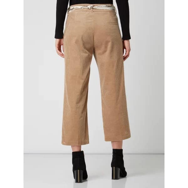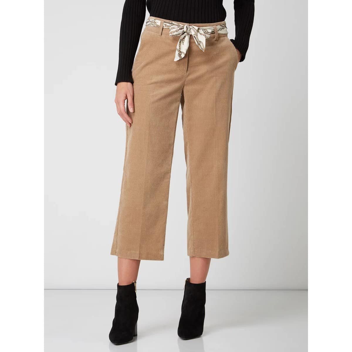 7/8 wijde pantalon van Cambio, model Claire. Deze broek is gemaakt van ribfluweel in camel en wordt geleverd zonder sjaaltje. De culotte sluit met een knoop, haakjes en rits en heeft een steekzakken en sier paspelzakken aan de achterzijde.