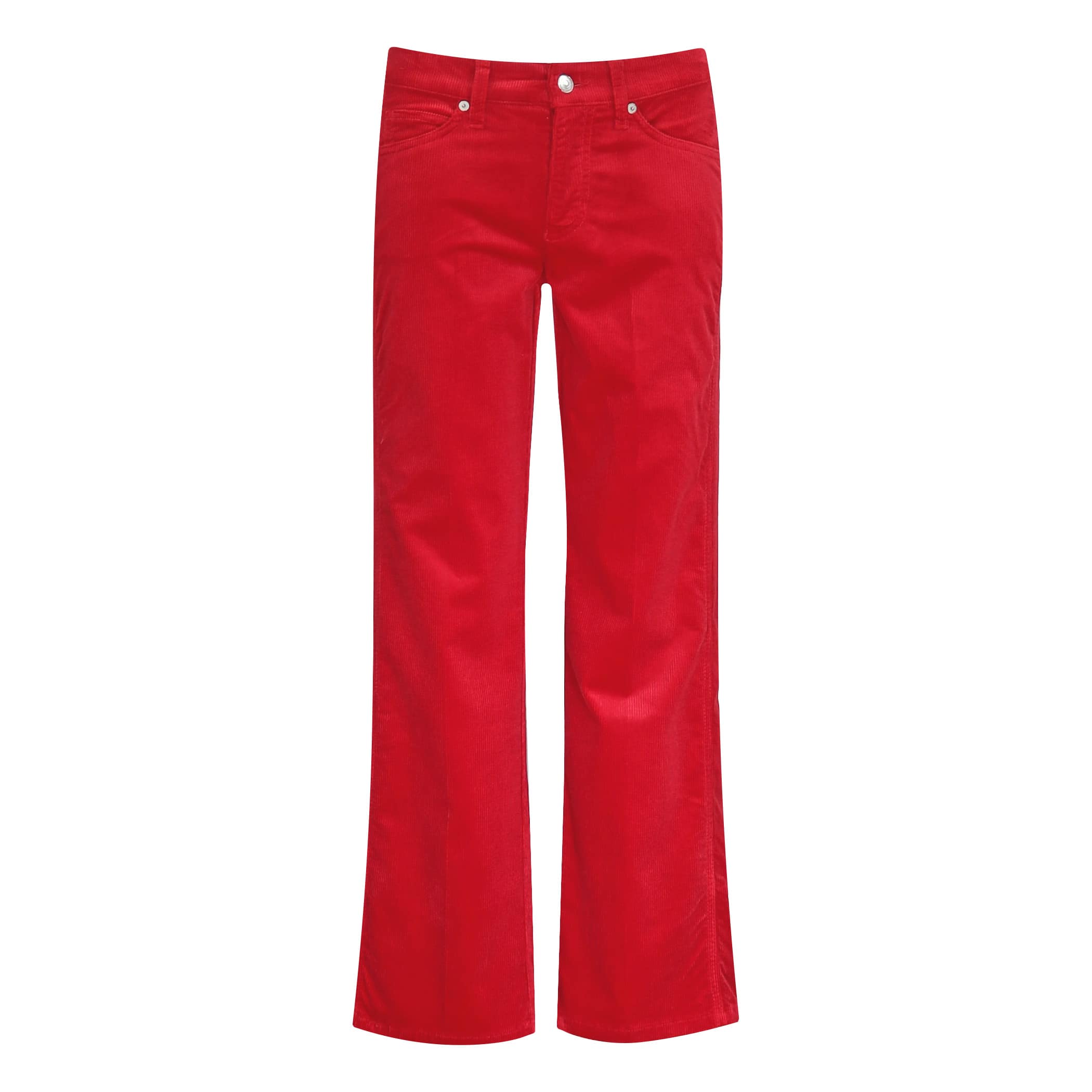 Corduroy pantalon van Cambio, model Francesca. Deze rode broek is gemaakt van een fijne ribfluwelen stretch stof en heeft rechte wijde broekspijpen die aan de onderzijde iets uitlopen. De broek sluit met een knoop- en ritssluiting, heeft twee steekzakken en twee achterzakken.