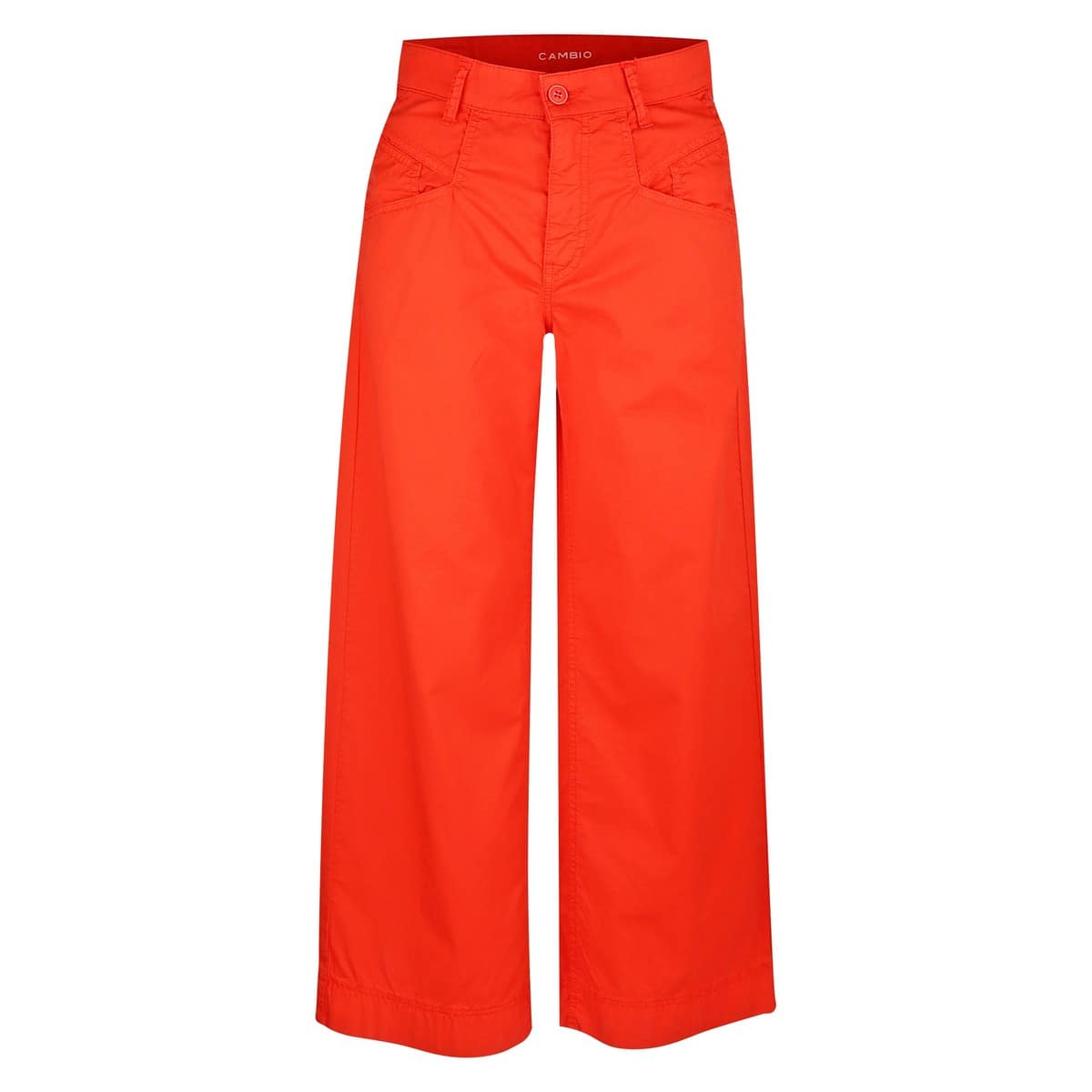 Koraal rode pantalon van Cambio. Deze katoenen broek heeft een hoge taille met wijde broekspijpen. De pantalon sluit met een knoop- en ritssluiting, heeft twee steekzakken aan de voorzijde en aan de achterzijde twee sier paspelzakjes.