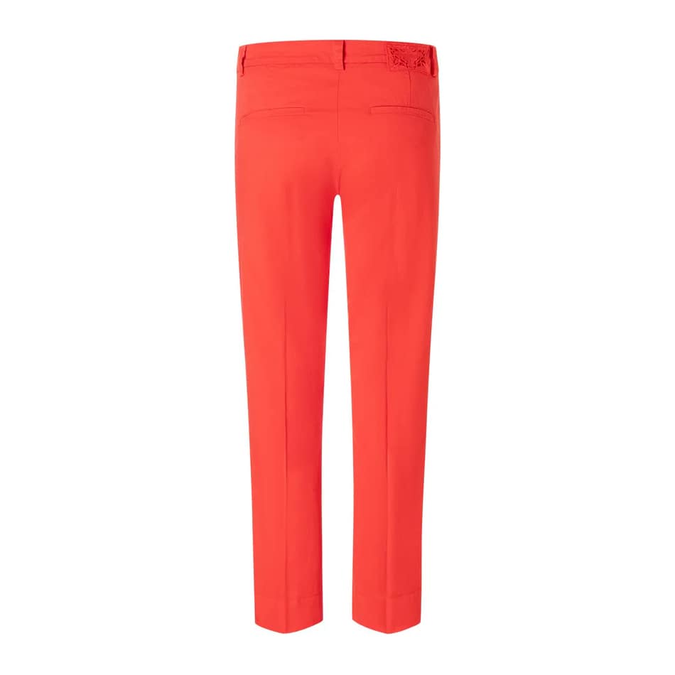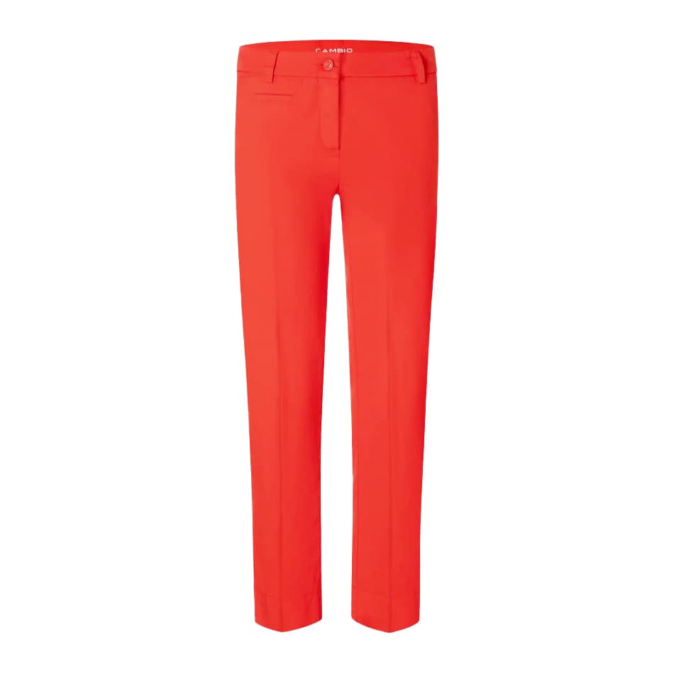Rode pantalon van Cambio, model Stella cropped in vulcano red. Deze broek heeft toelopende broekspijpen met een medium taille. De broek is gemaakt van katoenen stretch stof, heeft twee steekzakken en twee sier paspelzakjes aan de achterzijde.