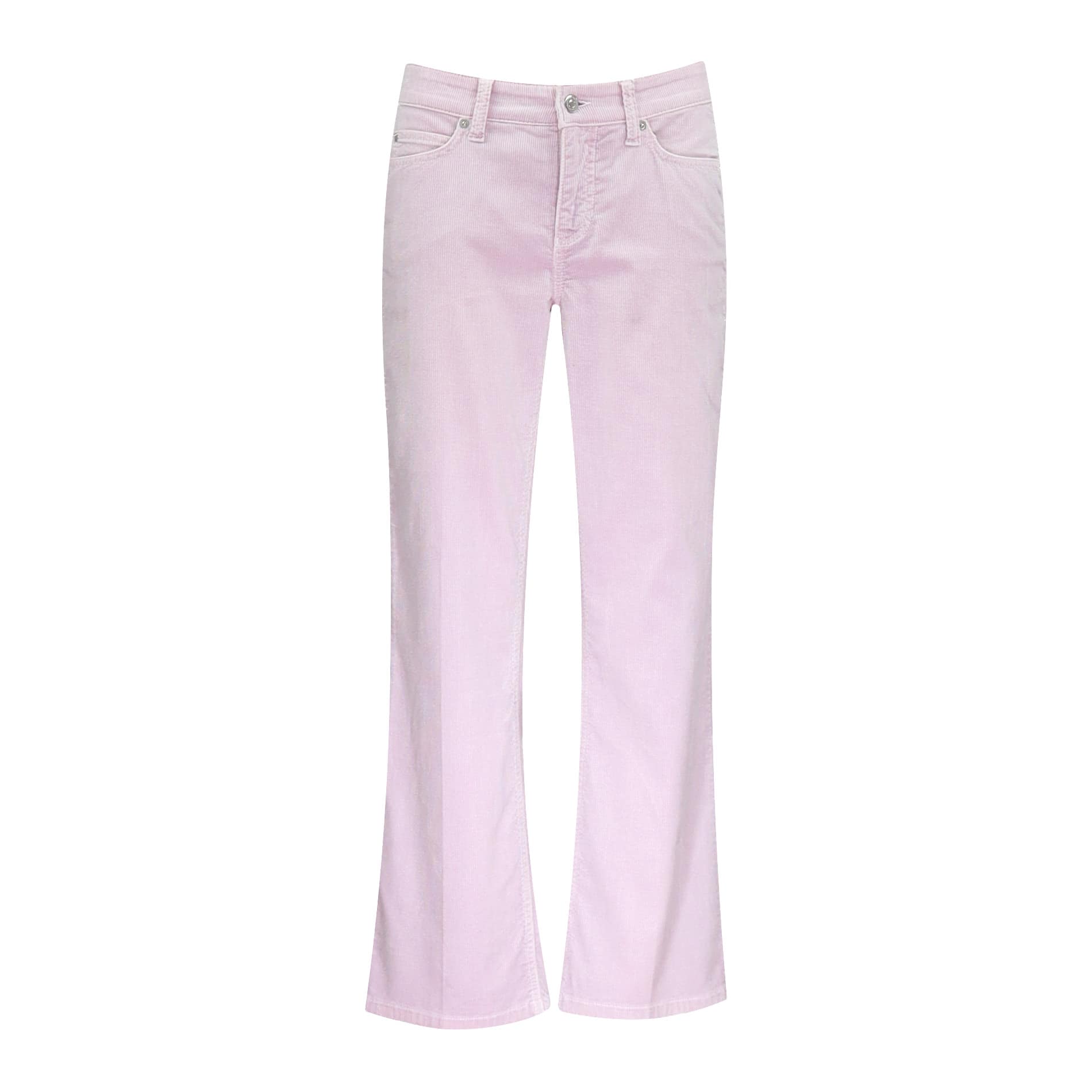 Slim fit pantalon van Cambio, model 5-pocket. Deze broek is gemaakt van een lichtroze ribfluwelen stretch stof. De corduroy broek heeft iets uitlopende broekspijpen, twee steekzakken, twee achterzakken en sluit met een knoop- en ritssluiting.
